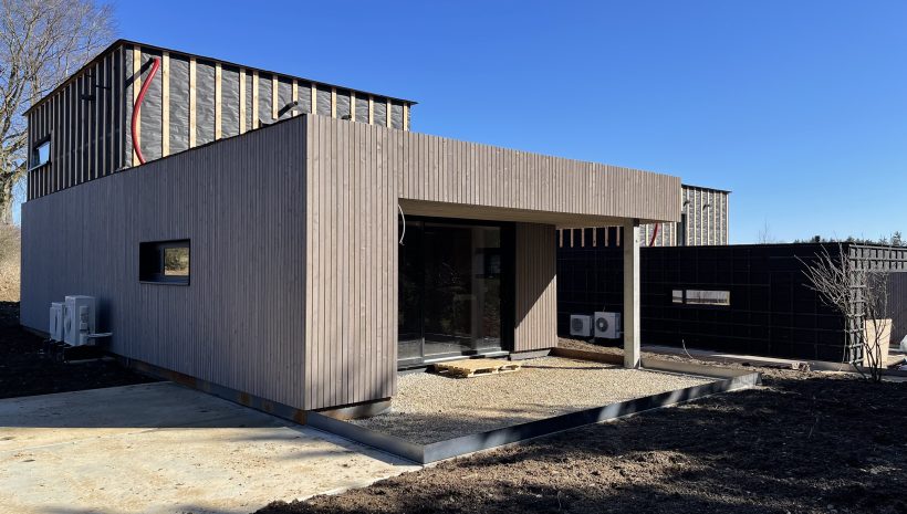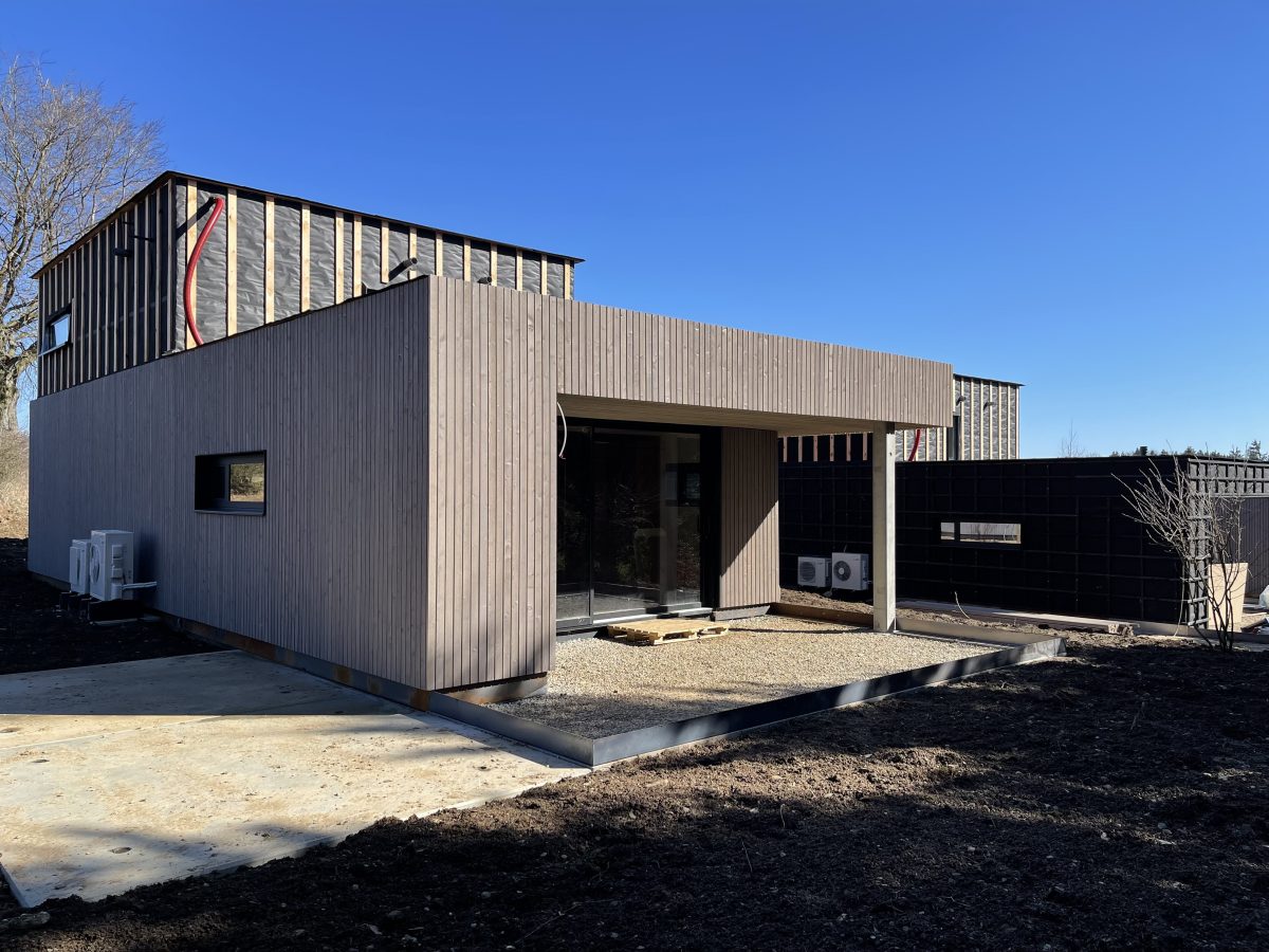 Die Villen von 71m2 bzw. 140m2 verfügen über 2 oder 3 Schlafzimmer und ebenso viele Bäder und Ankleiden. Sie sind komplett ausgestattet und kombinieren nachhaltiges Holz mit schwarzem Aluminium.