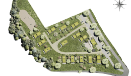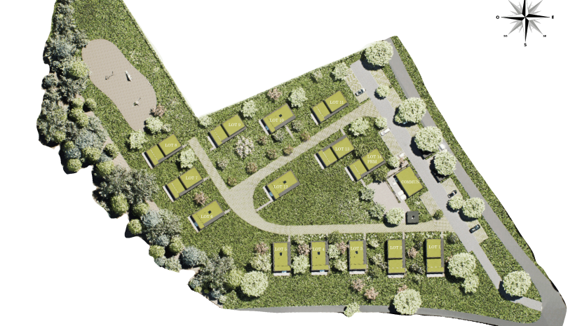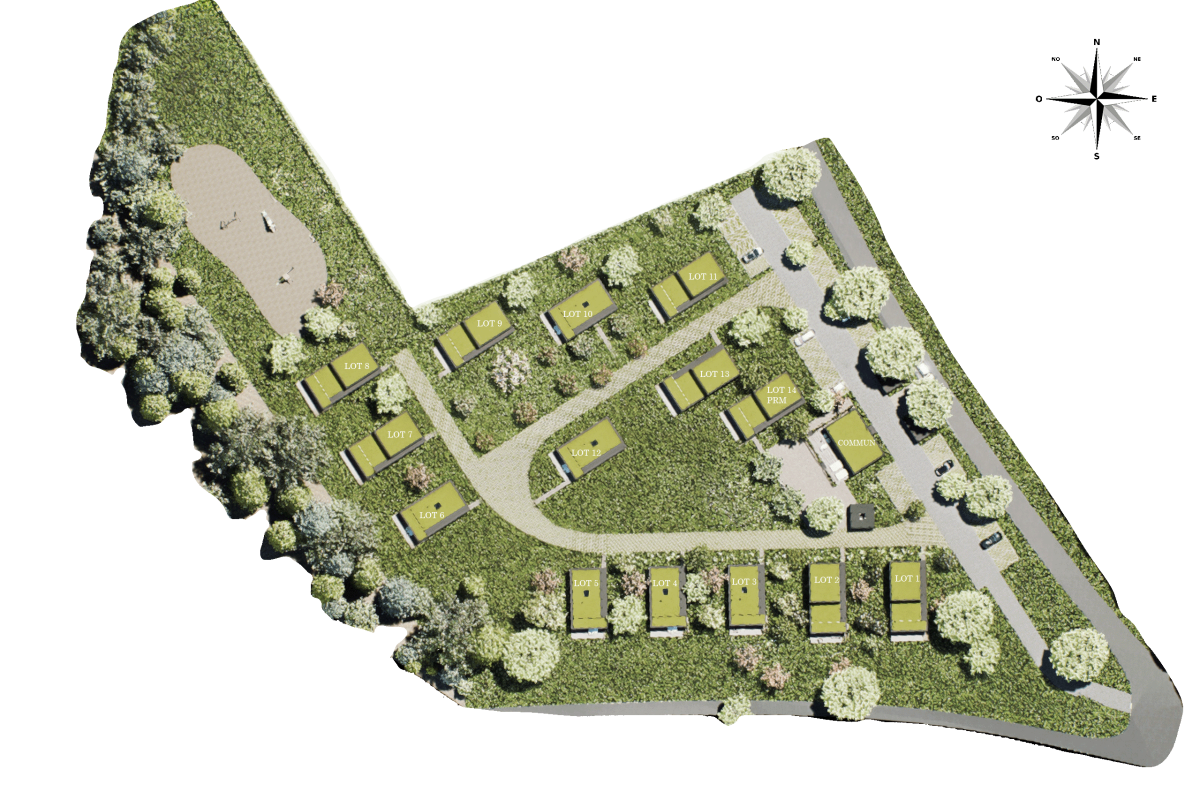 Jedes Haus befindet sich auf einem eigenen Grundstück und verfügt über eine halboffene Terrasse mit einem Außenschrank mit doppelter Tür mit Schloss. Neben den privaten Grundstücken gibt es weitere 9.313 m2 im Gemeinschaftseigentum. Darauf befinden sich u.a. ein Gemeinschaftsgebäude mit Küche, Sanitäranlagen und einer teilweise überdachten Terrasse, ein überdachter Grillplatz mit Kamin und Kochzonen, ein Raum zum Abstellen von Fahrrädern, ein Feld für das Boulespiel.