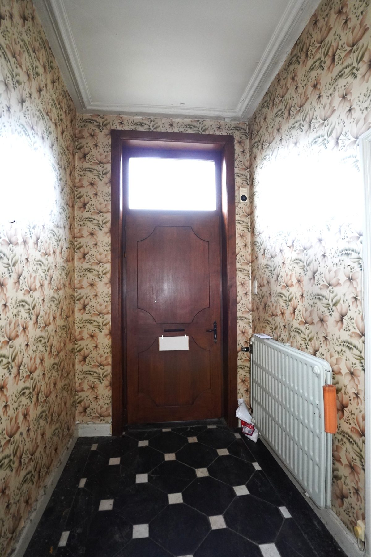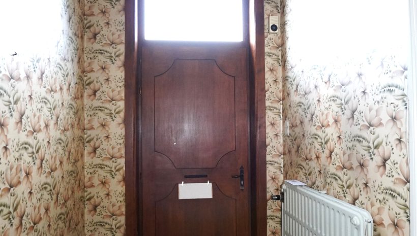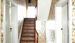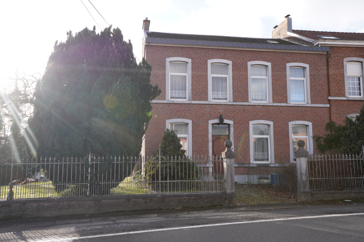 Die Einfahrt führt über zwei Stufen aus Blaustein zur schönen Holztür. Dieses natürliche Material findet sich auch in der Fassade wieder, sei es um die Fenster und Türen herum oder an der Straßenfront, wo der schmiedeeiserne Zaun den Vorgarten des Anwesens umschließt.