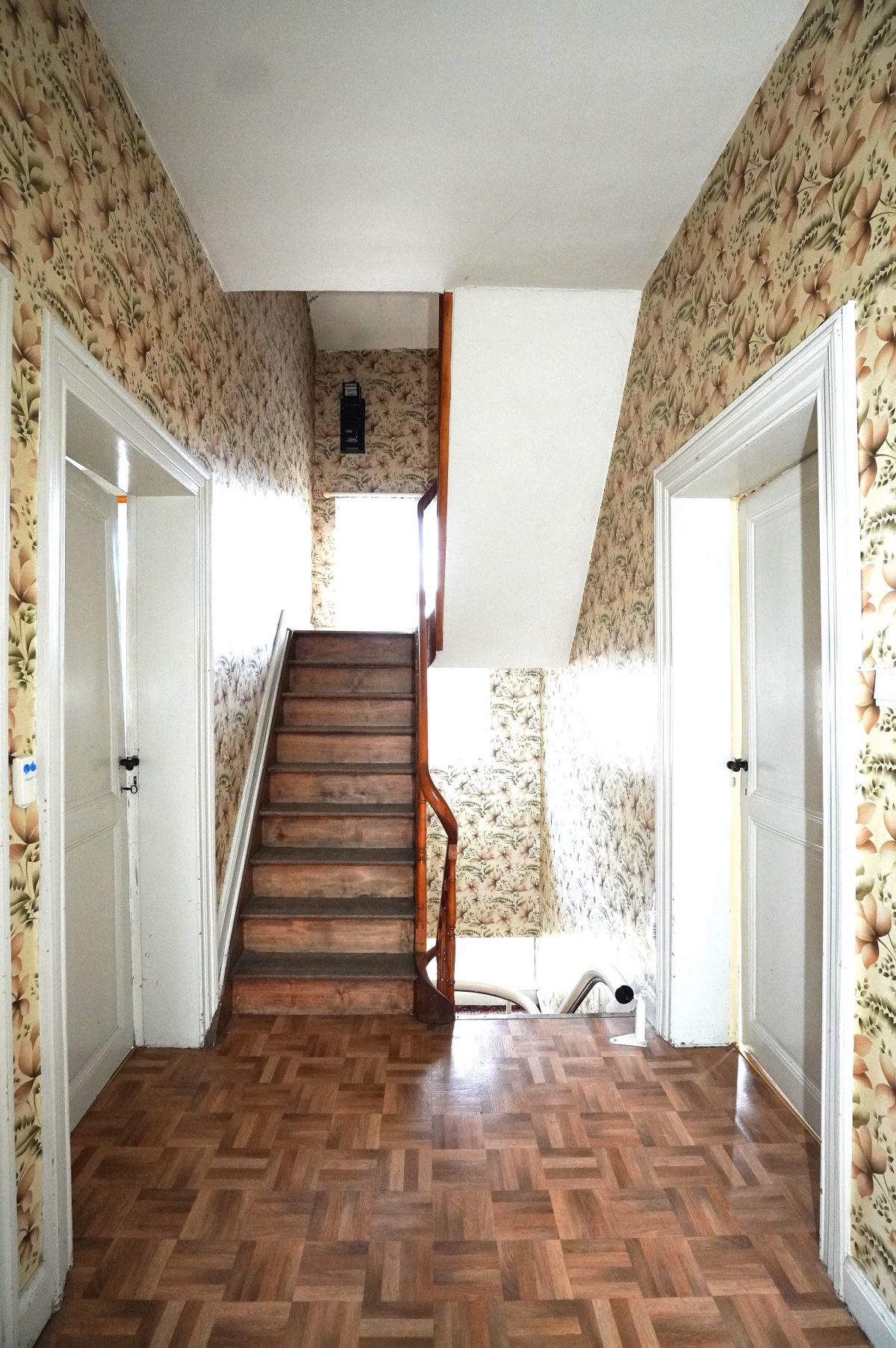 Erdgeschoss: Ein einladender Eingangsbereich mit einer schönen Holztreppe, die zu den oberen Etagen führt. Rechts vom Flur befindet sich ein Wohnzimmer mit Feuerstelle und Gusseisenkamin, das mit dem Esszimmer verbunden ist. Diese Wohnräume profitieren von einem schönen Parkettboden. Links befindet sich die Küche sowie ein weiteres Wohnzimmer oder Büro.