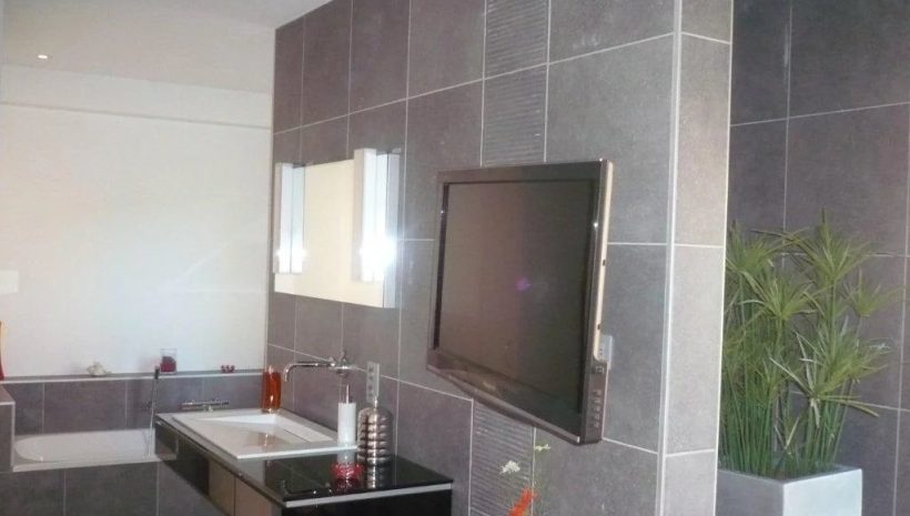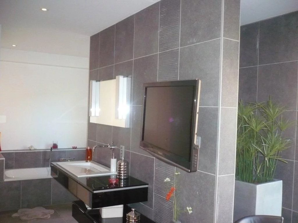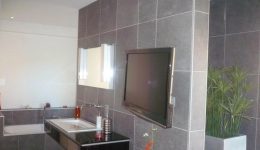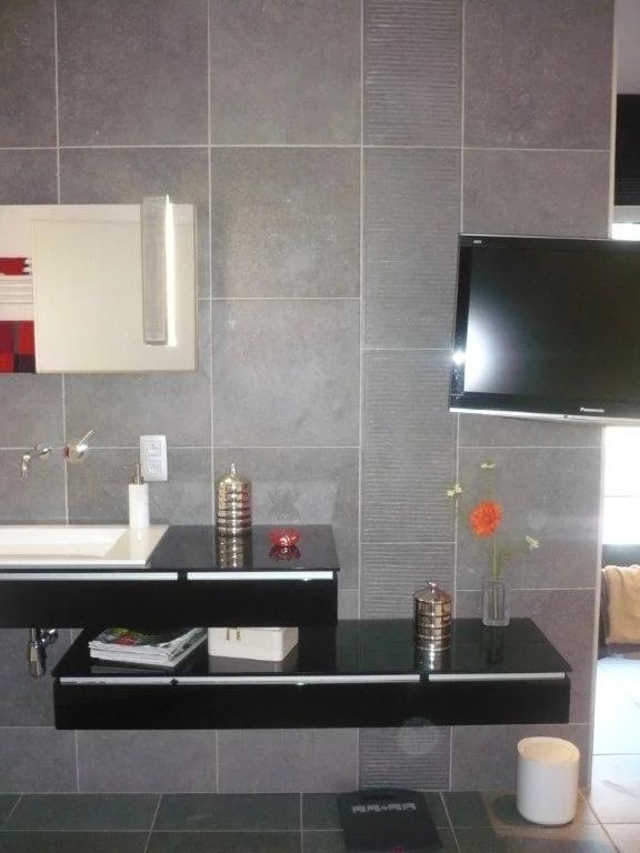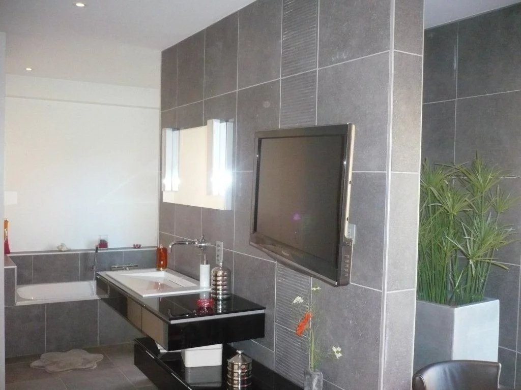 – Badezimmer. mit Badewanne und einer sehr großen. bodenebenen Dusche und modernen Möbeln