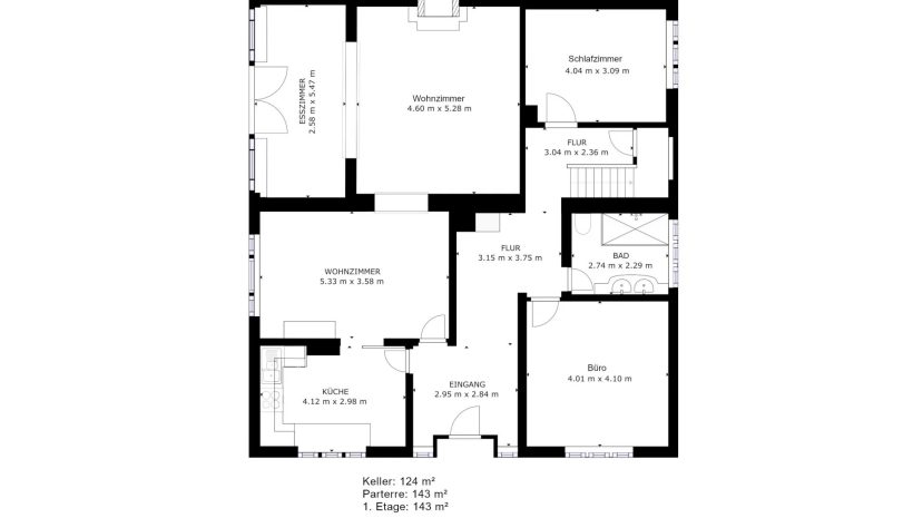 Im Erdgeschoss empfängt Sie ein einladender Eingang, das den Weg in den weitläufigen Wohn- und Essbereich mit offenem Kamin und direktem Zugang zur Terrasse eröffnet. Die Küche bietet viel Platz für gemeinsame Kochmomente. Ein Elternschlafzimmer mit eigenem Bad sowie ein separates Arbeitszimmer runden das Raumangebot auf dieser Etage ab.