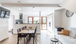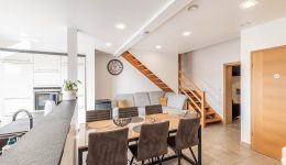 Die großzügige Ferienwohnung erstreckt sich über zwei Etagen und bietet 2 Schlafzimmer, ein Badezimmer sowie einen offenen Wohnbereich mit Küche, Ess- und Wohnzimmer. Eine schöne Terrasse rundet das Angebot ab.