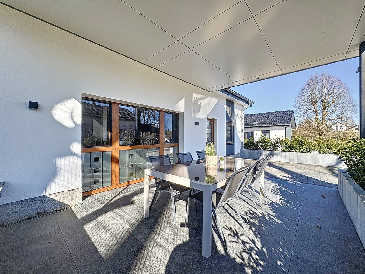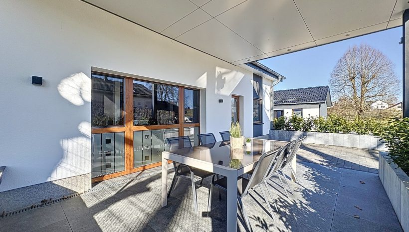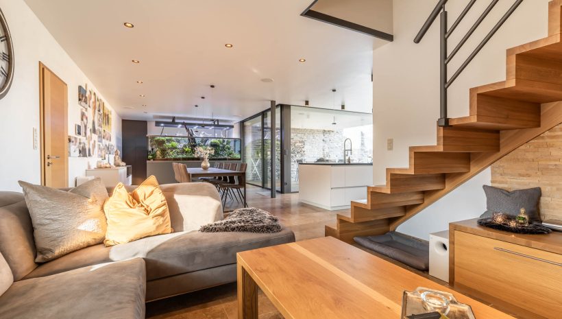 Im Erdgeschoss gelangen Sie über den einladenden Eingangsbereich in den lichtdurchfluteten Wohnbereich, bestehend aus Esszimmer, Wohnzimmer und einer offenen Küche mit direktem Zugang zur überdachten Terrasse sowie zum gepflegten Garten und Außenbereich.
