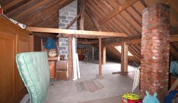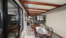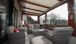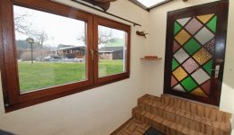 1. Etage: Eine Diele, ein gemütliches Wohn- und Esszimmer mit Holzofen, angrenzende Veranda mit direktem Zugang zum Rasen, 2 Schlafzimmer (eins mit eigenem Waschbecken und Dusche), ein WC, eine Einbauküche sowie ein Badezimmer mit Badewanne und Waschbecken.