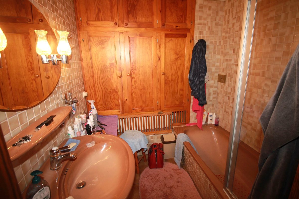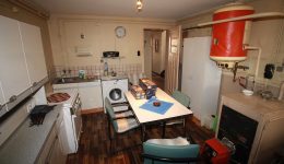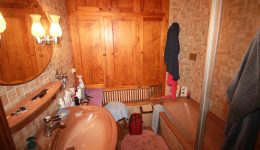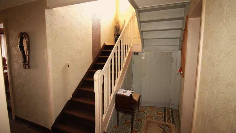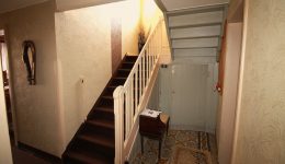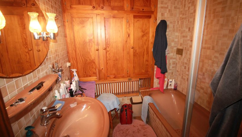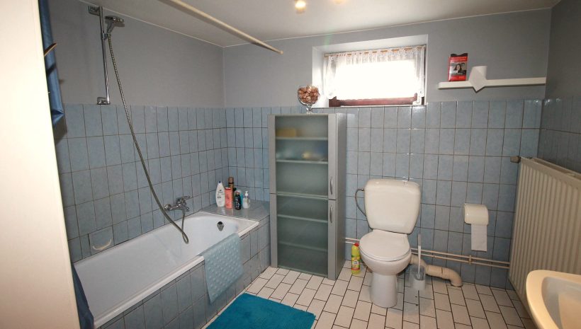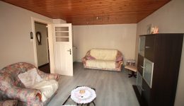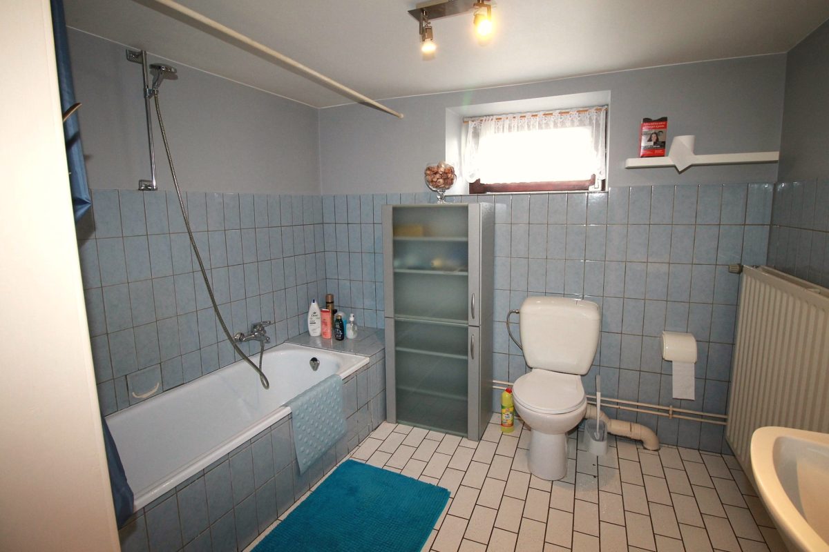 Erdgeschoss: Diele, Wohnzimmer, Einbauküche, Heizraum mit direktem Ausgang zum Garten, Badezimmer mit Wanne, Waschbecken und WC.