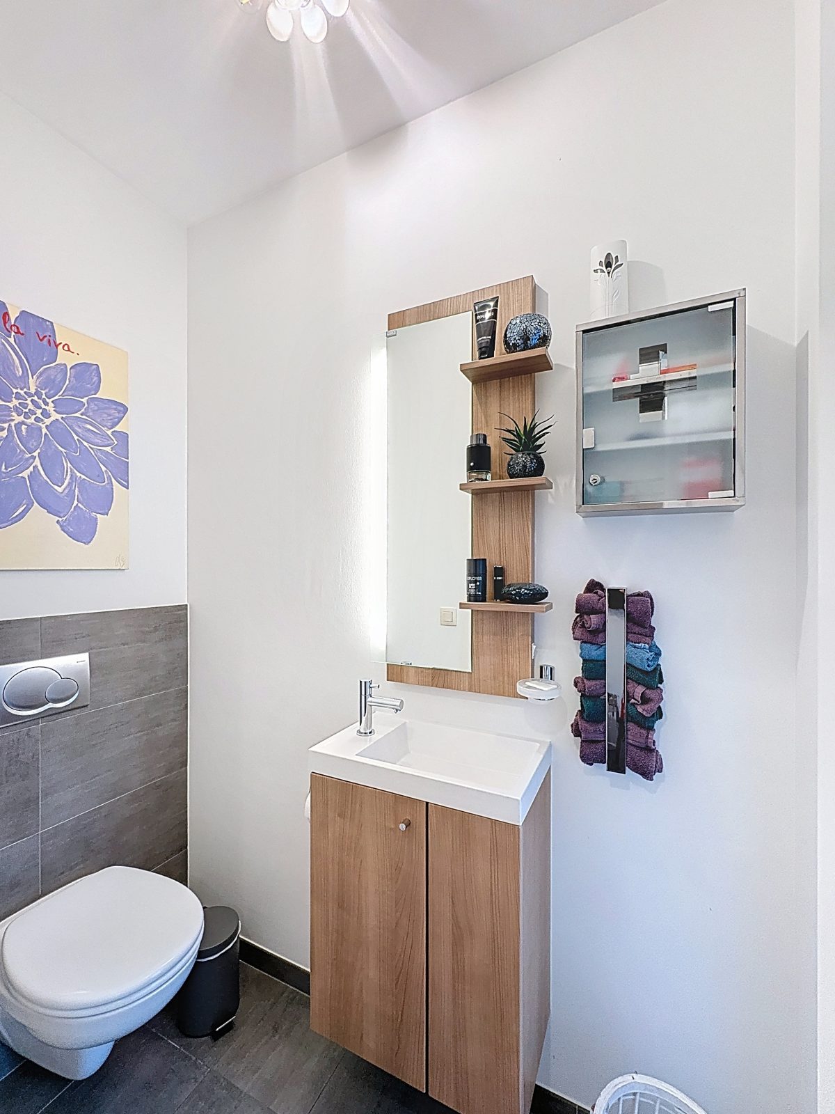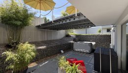 Eine voll ausgestattete Küche mit Zugang zur Terrasse, ein Esszimmer, ein Eingangsbereich mit separatem WC, ein Technikraum (Atelier/Keller).
