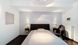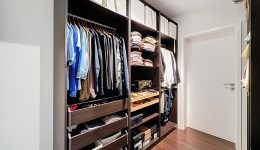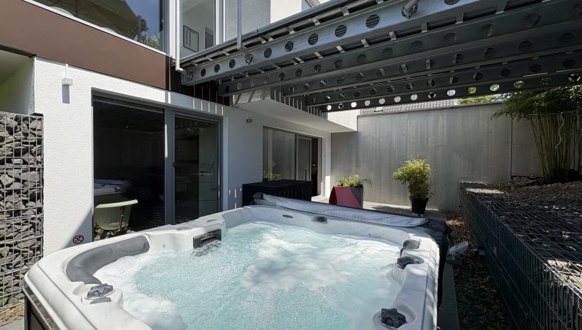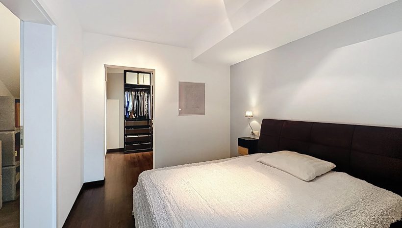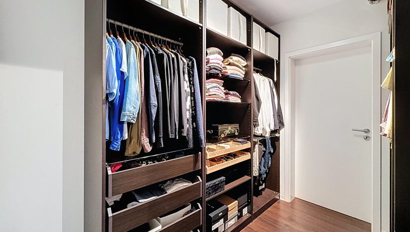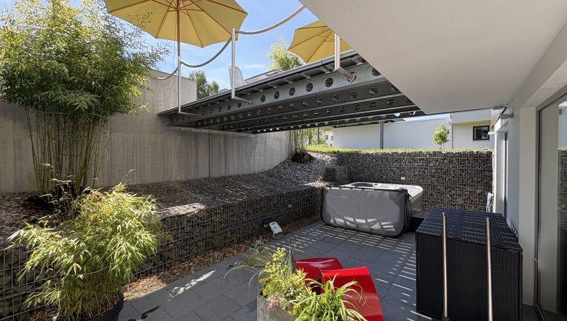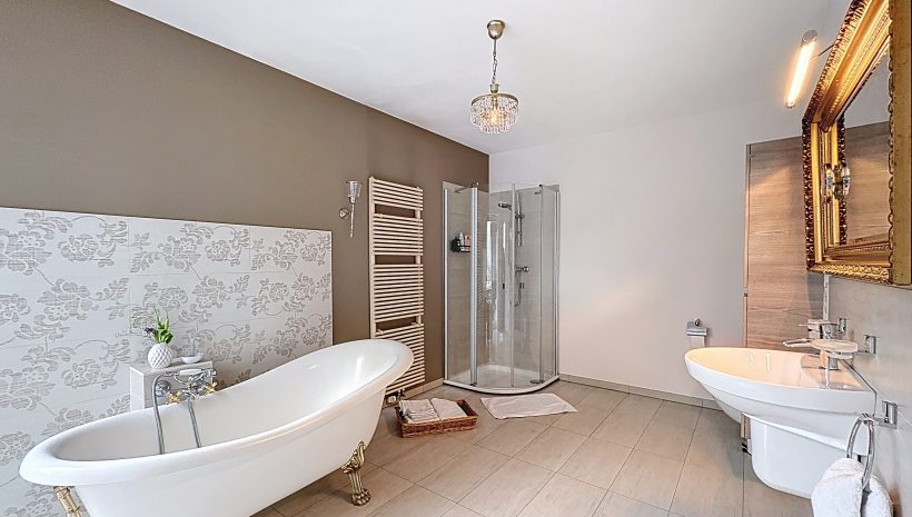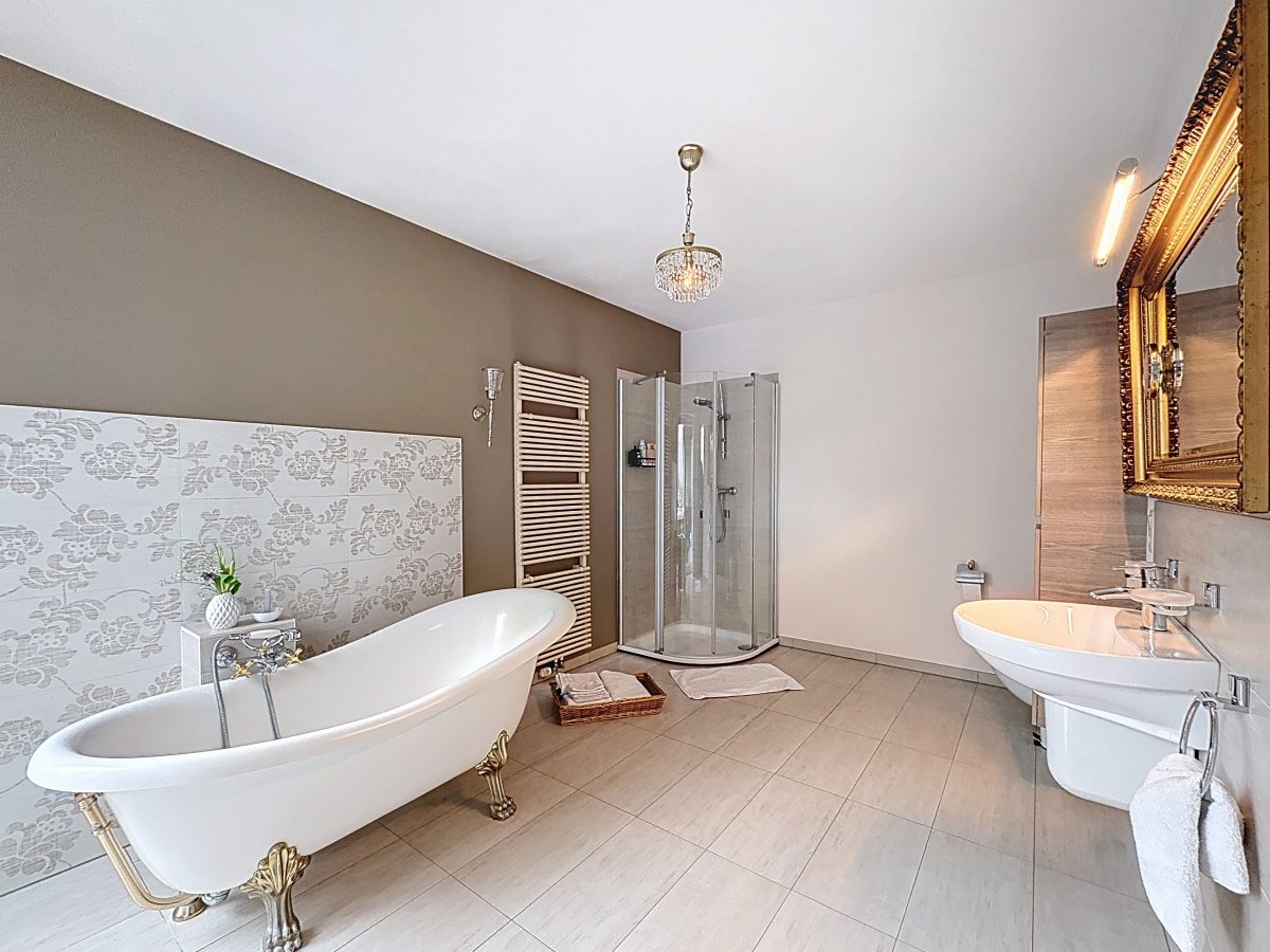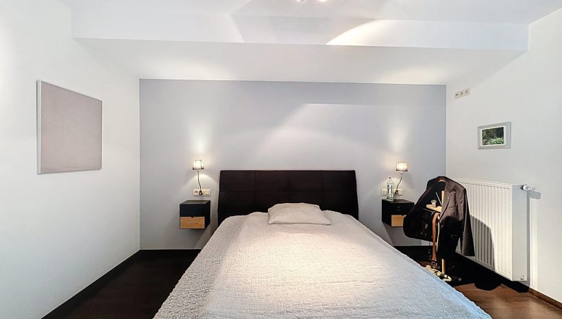 Ein Elternschlafzimmer mit Ankleidezimmer, Badezimmer und Zugang zur großen Terrasse sowie eine Waschküche mit direktem Zugang zum großen, gepflegten Garten.