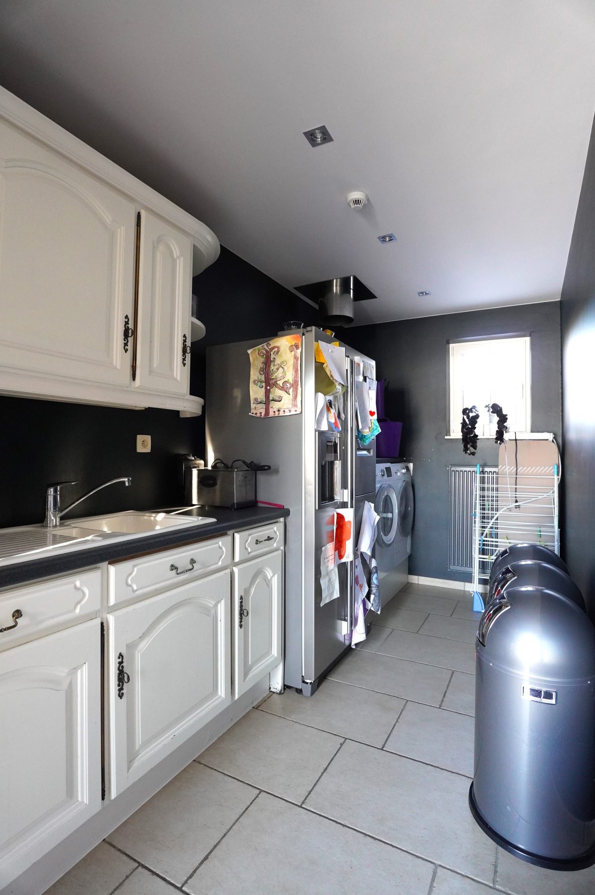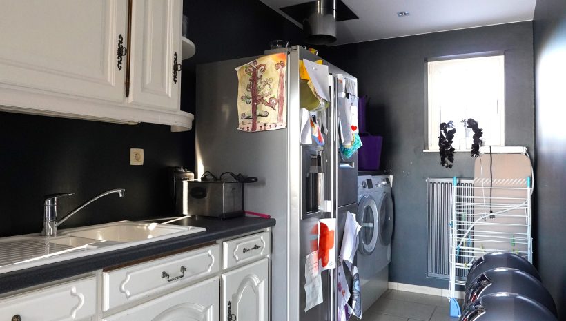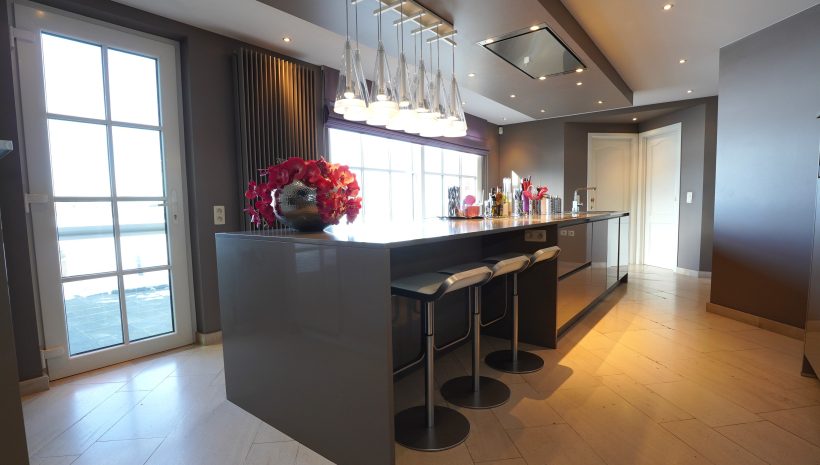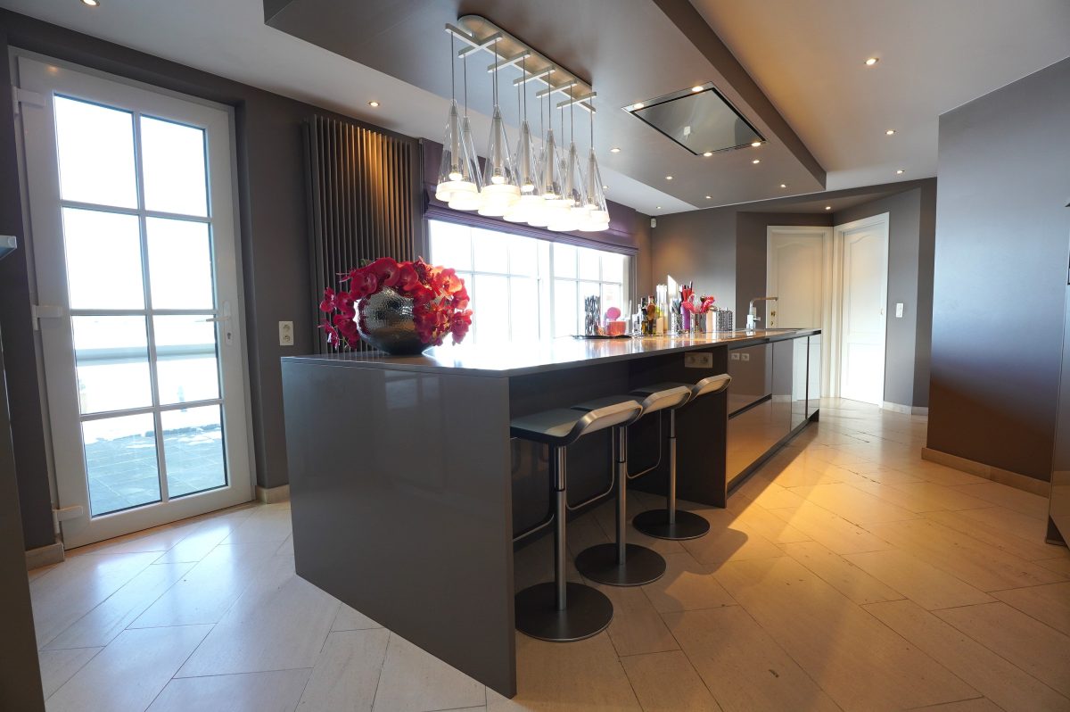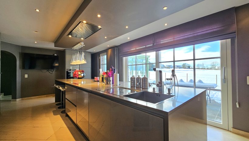 Vom Esszimmer aus gelangt man über eine gewölbte Öffnung in die moderne Küche, die mit hochwertigen Geräten und großzügigen Arbeitsflächen bestens ausgestattet ist. Die Küche führt sowohl in den praktischen Hauswirtschaftsraum, der über Anschlüsse für die Waschmaschine verfügt, als auch in einen zusätzlichen Abstellraum, der weiteren Stauraum bietet.
