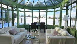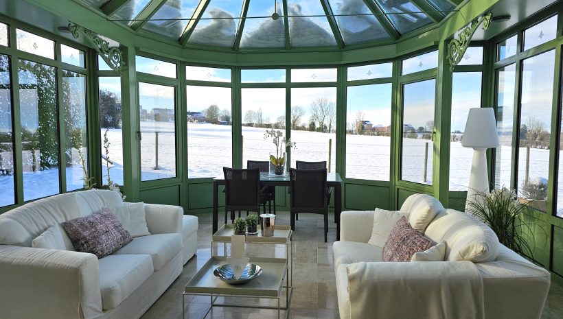 Der einladende Eingangsbereich mit beeindruckender Deckenhöhe führt in das lichtdurchflutete Esszimmer, das durch eine kleine Stufe und eine stilvolle Mauer mit Holzkassette in das gemütliche Wohnzimmer übergeht. Das Wohnzimmer führt durch zwei Glastüren zur hellen Veranda. Von dort aus genießt man einen atemberaubenden Panorama-Ausblick auf den Garten und die umliegende Natur.