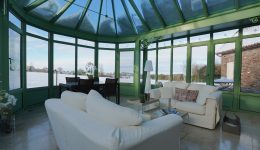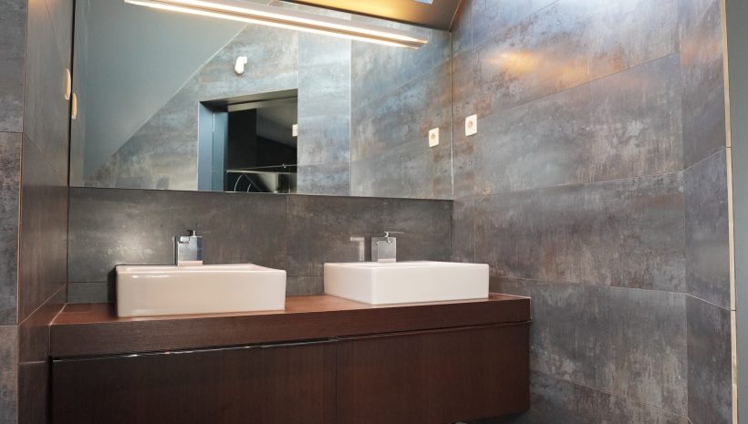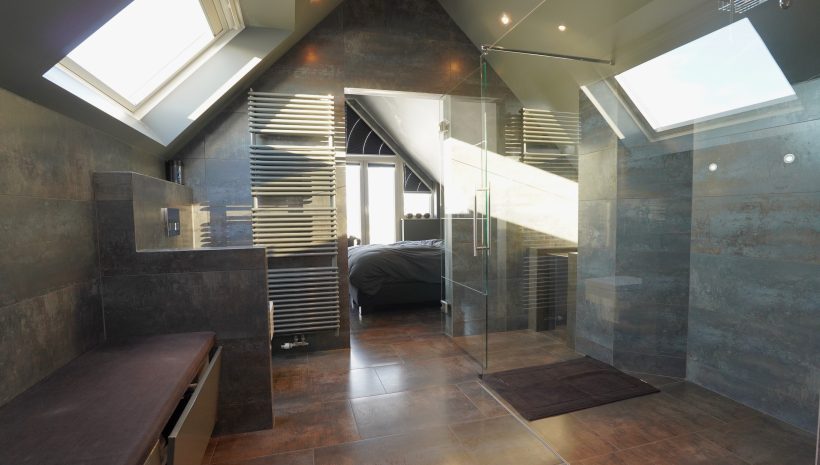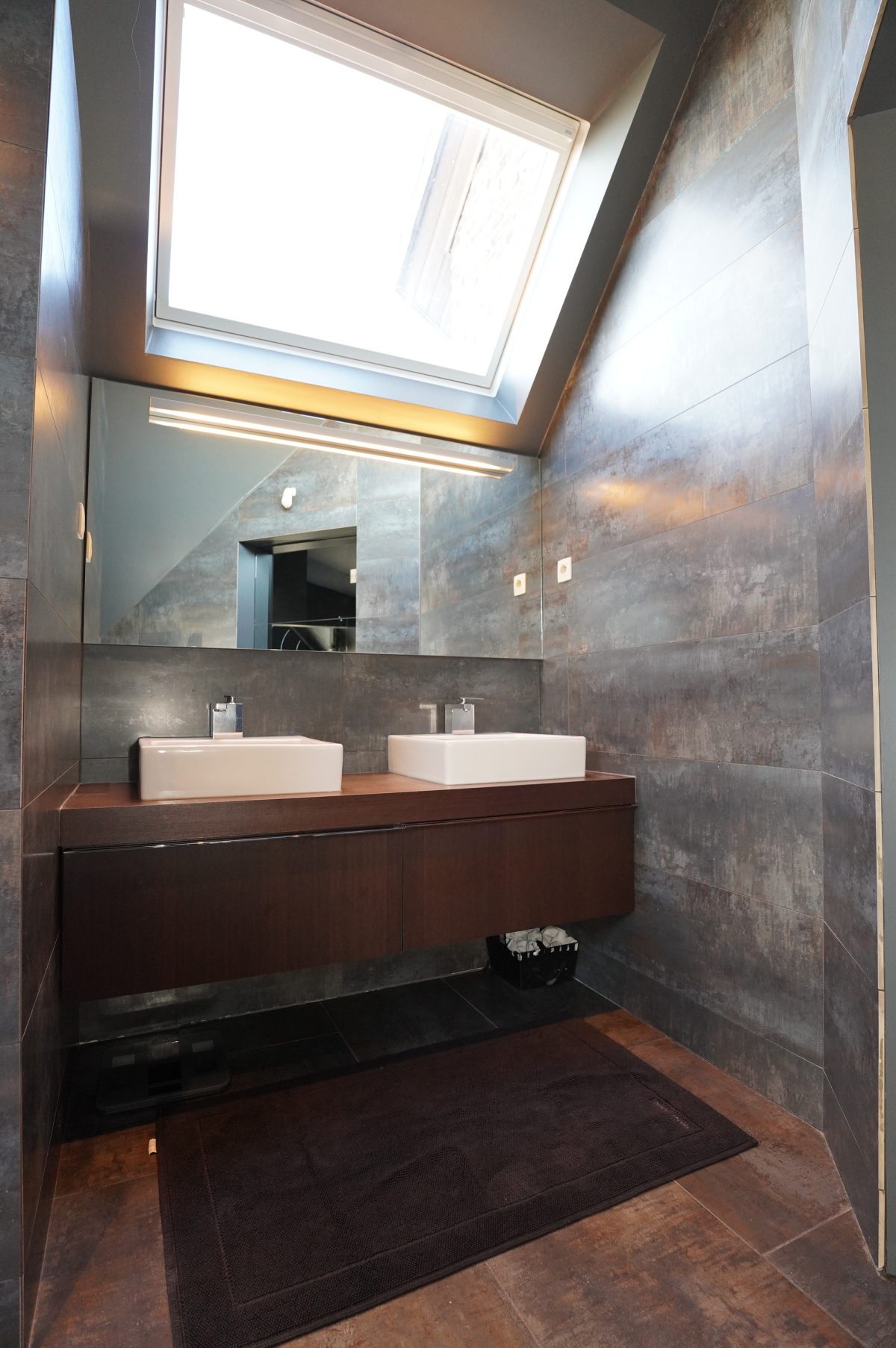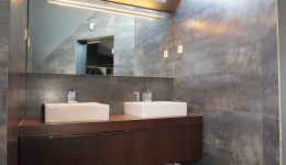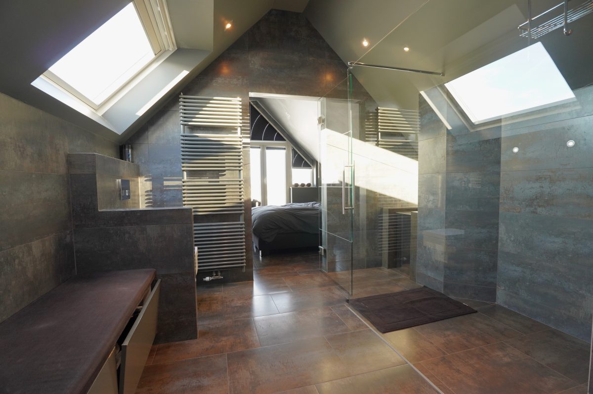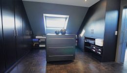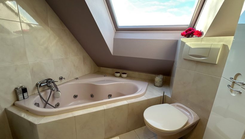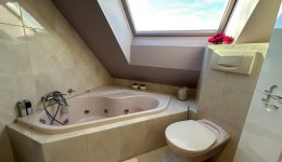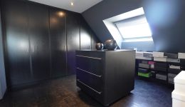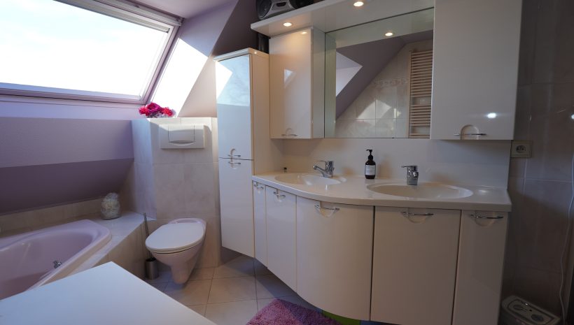 Im Obergeschoss befindet sich ein elegantes Ankleidezimmer, das zum modernen Badezimmer übergeht, ausgestattet mit einer großen begehbaren Dusche, doppelte Waschbecken und WC; und einem Schlafzimmer, das einen herrlichen Blick auf den Garten bietet. Vom Flur aus gelingt man zu 2 großzügige Schlafzimmer und einem zweiten Badezimmer mit Dusche, Badewanne, WC und Waschbeckenmöbel.