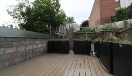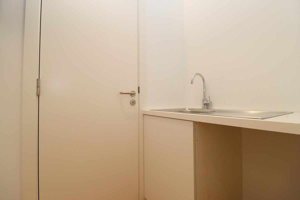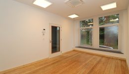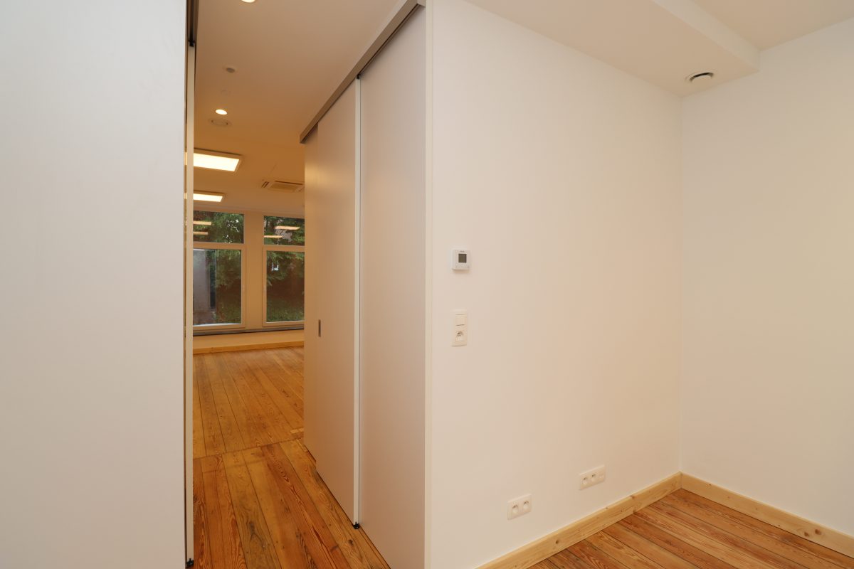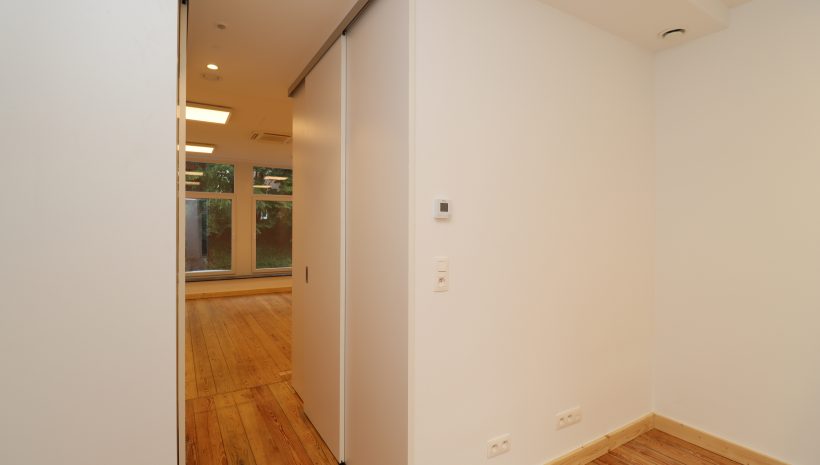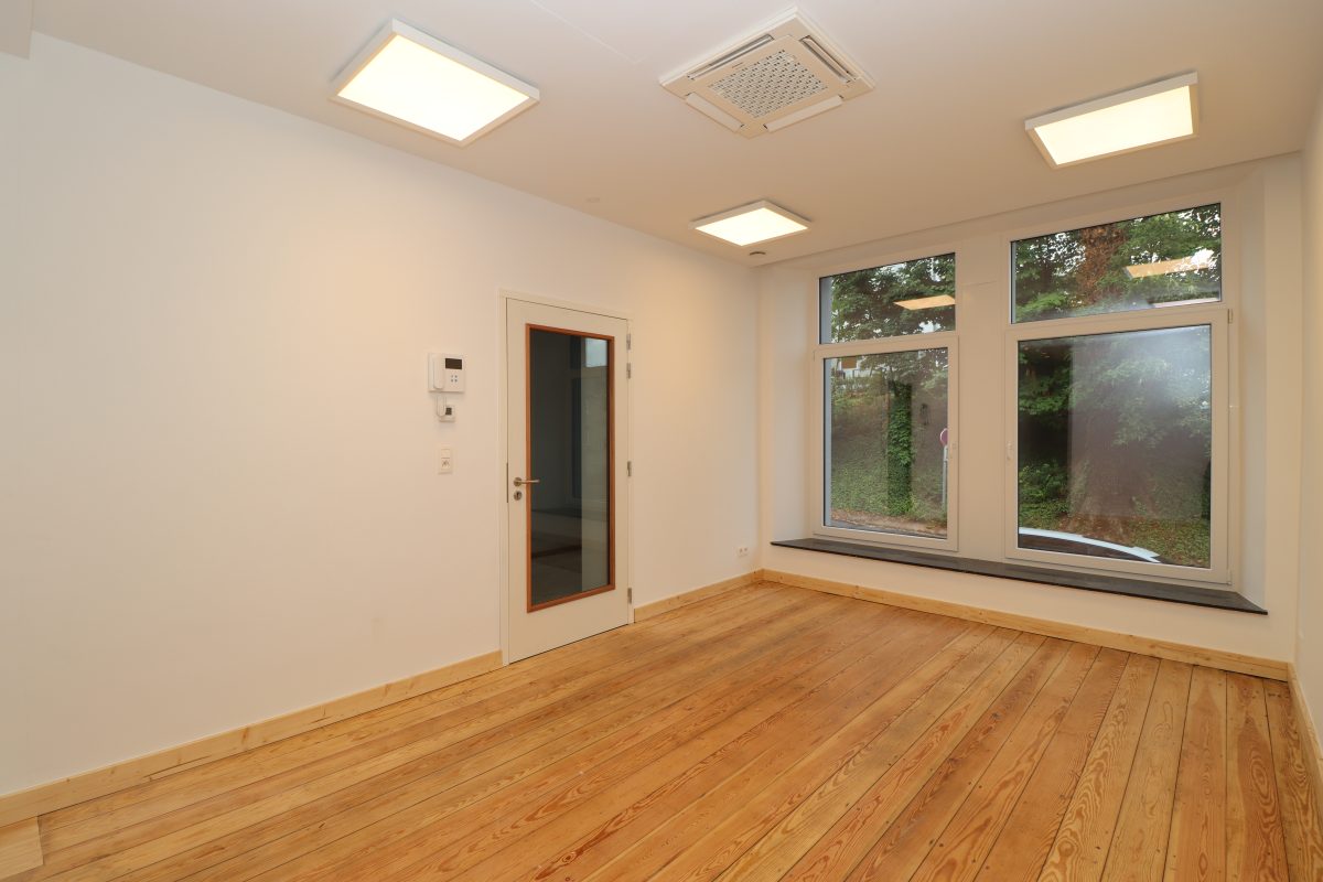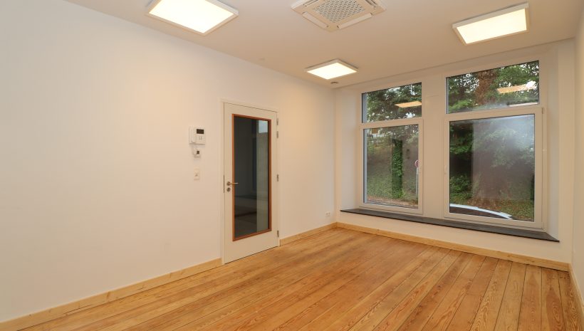 2 Büroräume, einer zur Straßenseite hin gelegen und einer nach hinten zur Gartenseite hin, eine Kitchinette (kleine Teeküche mit Kochmöglichkeit) sowie ein Gäste-WC. Problemlos können hier mehrere Arbeitsplätze untergebracht werden. Für die Mittagspause oder für eine geschäftliche Unterredung im Freien bietet sich eine windgeschützte Terrasse im Innenhof an, welche direkt vom hinteren Büro aus zugänglich ist.