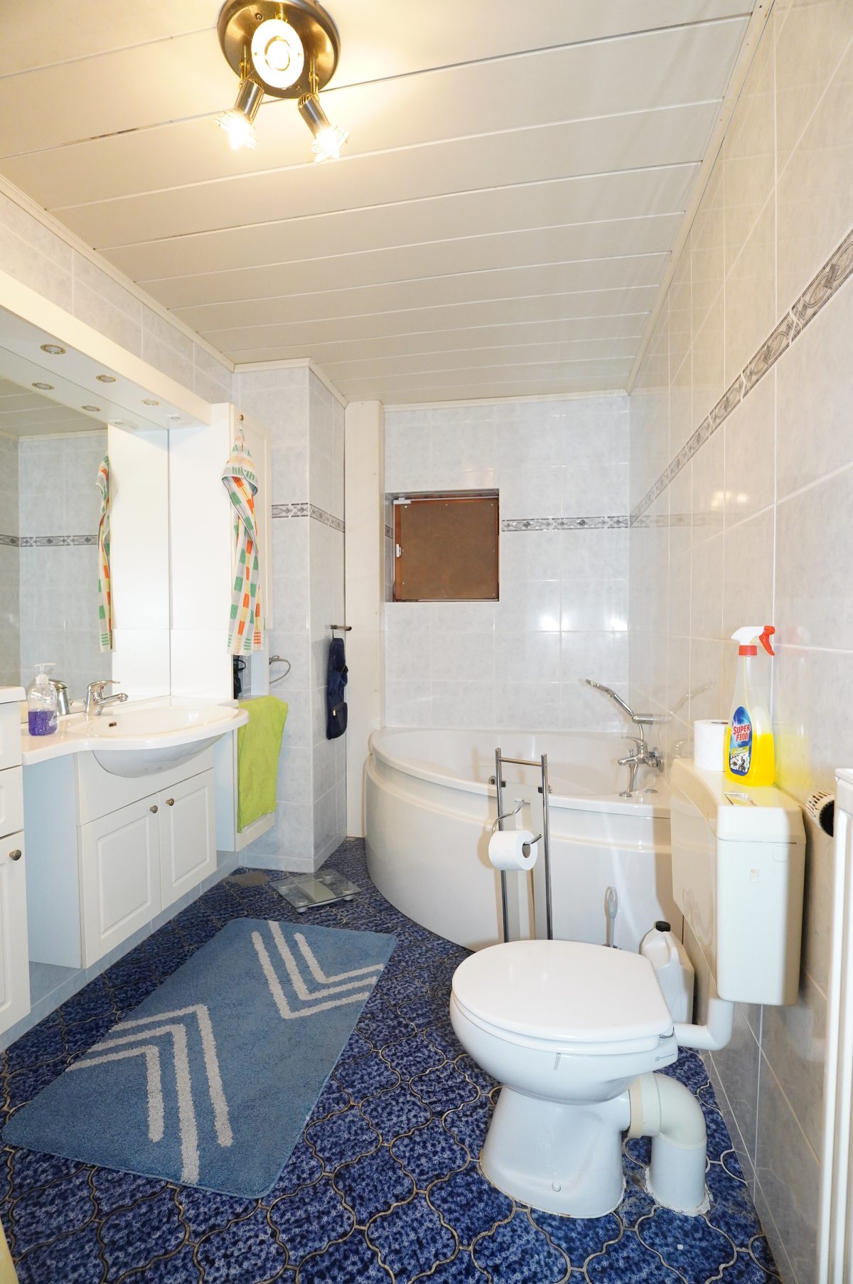 Geräumiger Eingangsbereich mit großem Garderoben-/Empfangsbereich, Büro, 3 Schlafzimmer, kleiner Waschraum mit Anschluss für Waschmaschine und WC, Badezimmer mit Whirlpool, Waschbecken, Dusche und WC, Flur mit Treppenabsatz, der den Zugang zur ausgestatteten Küche und dem großen Wohnzimmer mit Holzkassette ermöglicht. Von der Küche aus gelangt man durch eine große Holztür auf die Terrasse und den schönen Garten. Die meisten Fenster sind aus Holz mit Doppelverglasung und Fensterläden, ein anderer Teil ist aus PVC mit Doppelverglasung.