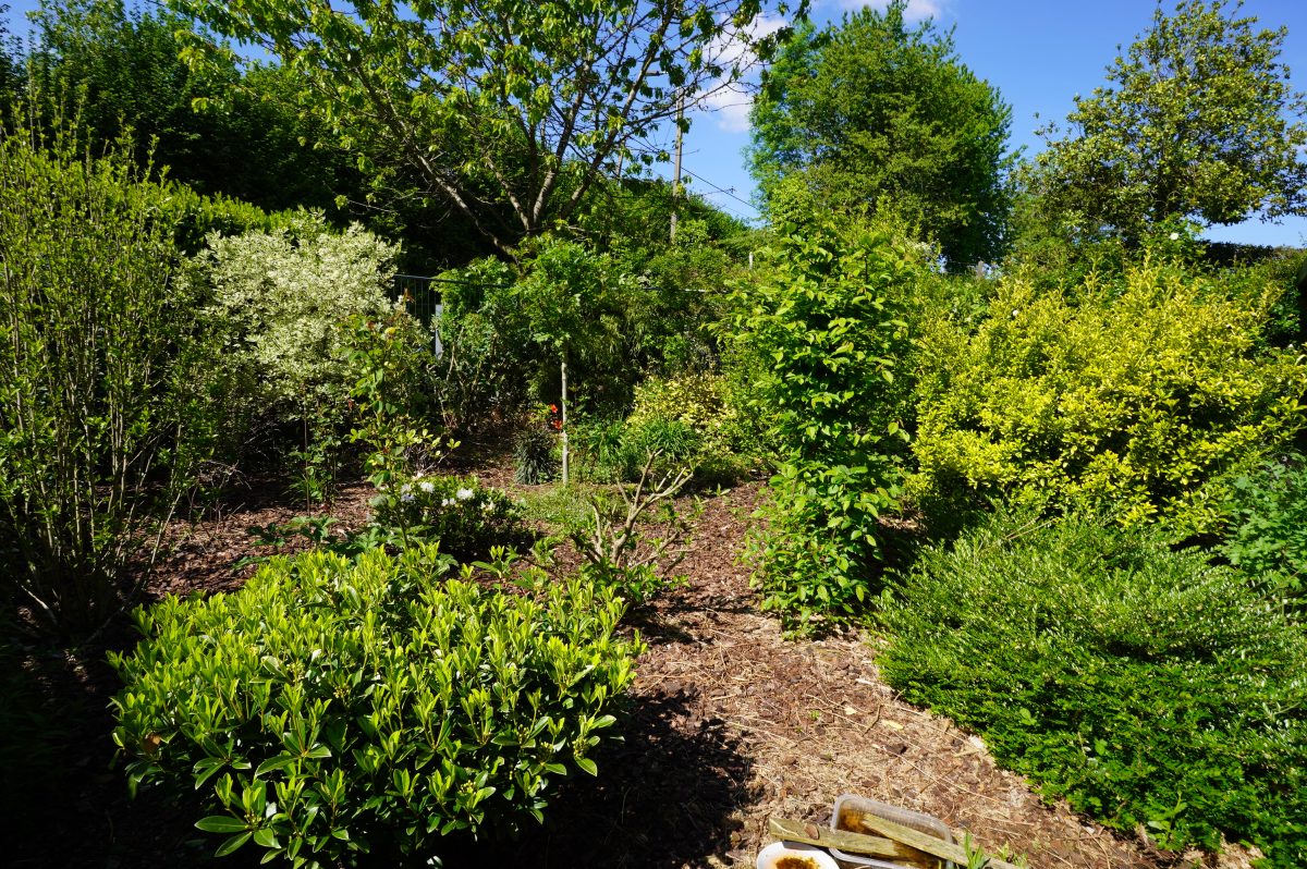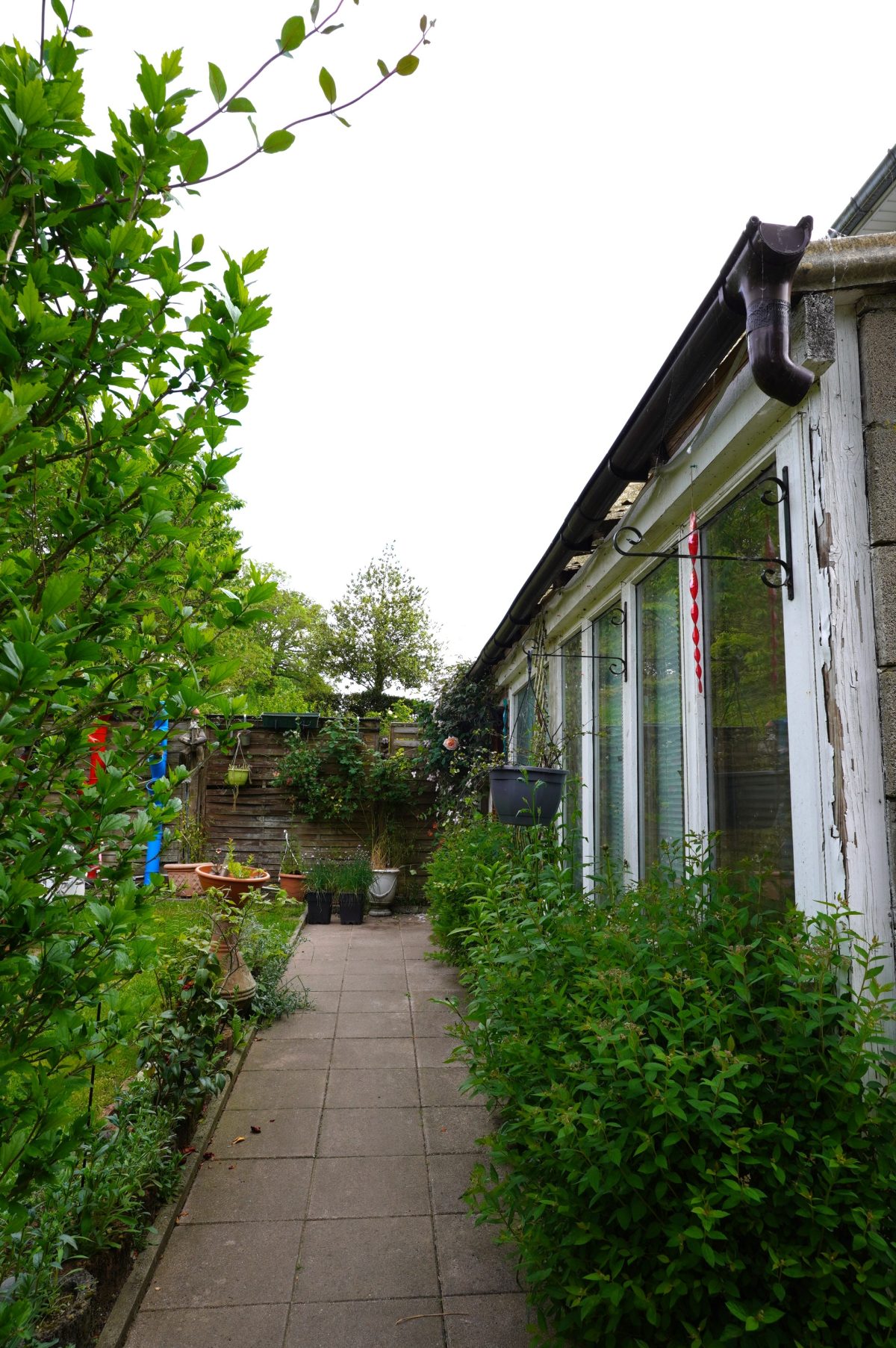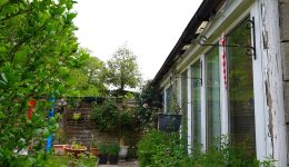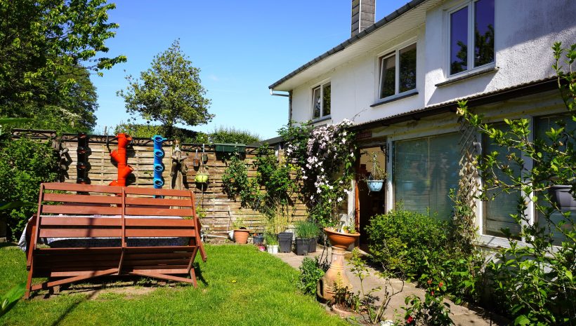 Wohnung im hinteren Erdgeschoss des Gebäudes, das über die rechte Einfahrt erreichbar ist, mit Terrasse und Garten.
