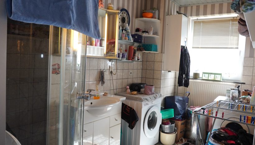Eingangsbereich mit Treppen, die zur Wohnung führen, separates WC, geräumige Küche, schönes Wohnzimmer, 1 Schlafzimmer, Badezimmer mit Dusche, WC, Waschbecken und Anschlüssen für die Waschmaschine.