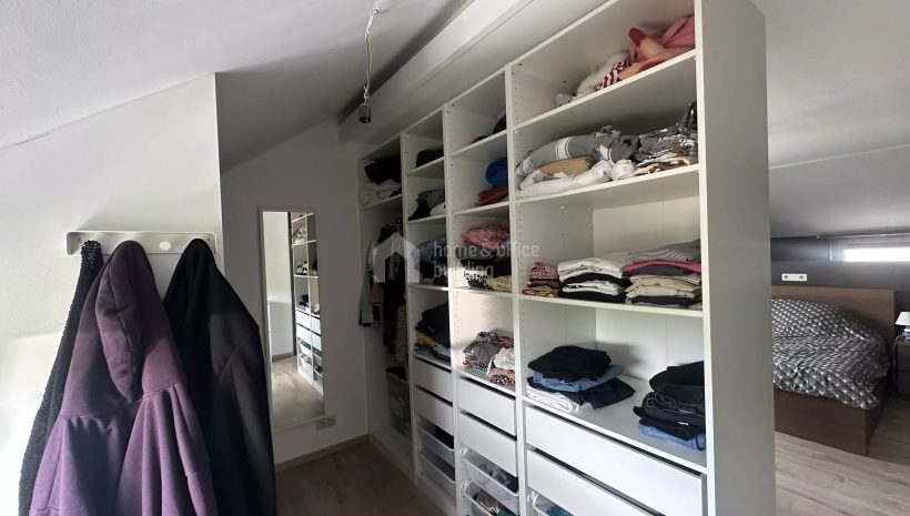 Die Wohnung setzt sich wie folgt zusammen : Eingang (3,90 m²) – Wohnzimmer (31,90 m²) – Einbauküche (10 m²) – Wäscheraum (3 m²) – Schlafzimmer (28,74 m²) – Toilette (1,41 m²) – Badezimmer (7,60 m²) – Balkon (5 m²) – überdachte Terrasse (17,40 m²) – Innenparkplatz- Keller (5 m²)