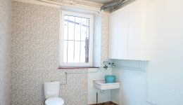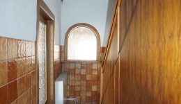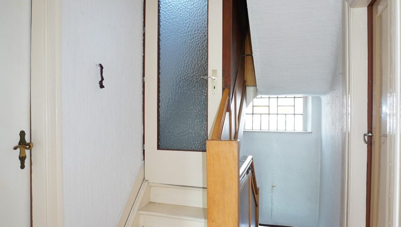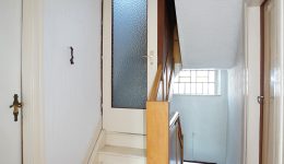 Der Eingang befindet sich auf der rechten Seite des Hauses, wobei die Eingangstür diskret im kleinen Hinterhof versteckt liegt. Die Eingangsdiele, mit seinem Holztreppenhaus zu den oberen Etagen, bietet Zugang zur, mit Eichenholz ausgestatteten, Küche, zum sehr geräumigen und lichtdurchfluteten Wohnzimmer, über eine schöne Holzschiebetür, sowie zur Waschküche, die ebenfalls mit einem WC ausgestattet ist.
