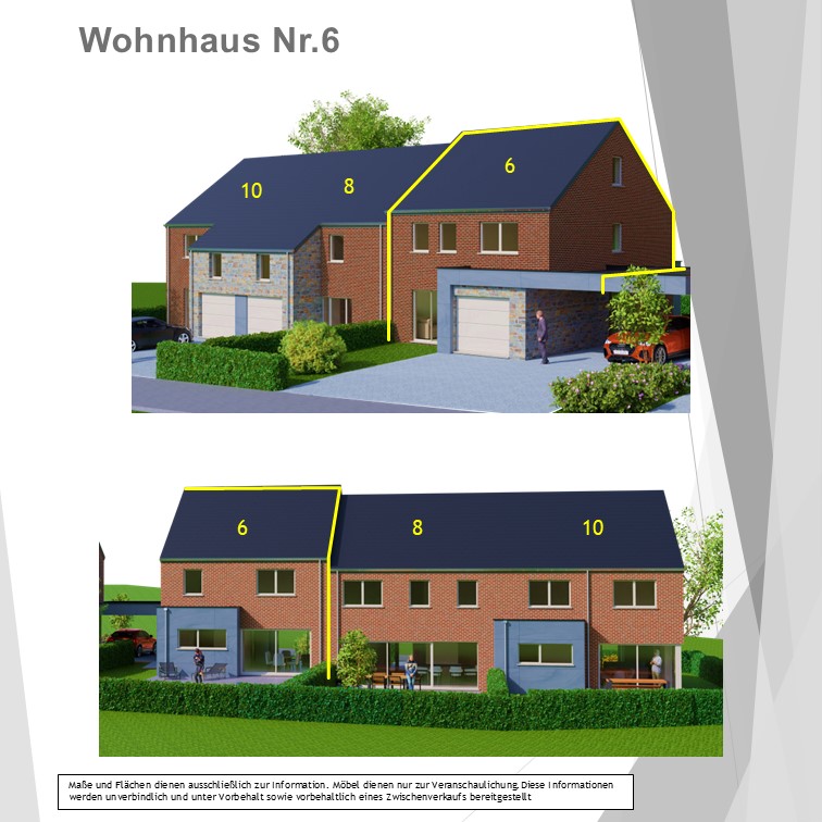 Wunderschönes neues Reihenmittelhaus im Bau nach modernsten Standards. Es handelt sich um einen Neubau auf einem cirka 242 m² grossen Baugrundstück und ausgestattet mit allen modernen technischen Anforderungen. Alle Böden sind komplett gefliest, das Haus hat ebenfalls eine geflieste Terrasse sowie einen mit Bodenklinkern ausgelegten Weg zum Eingang und zur Garage. Alle Wände sind weiss gestrichen. Kommen wir nun zur Raumaufteilung, auf dem Erdgeschoss befindet sich die Eingangsdiele mit Gäste-WC und dem Zugang zum wunderbar lichtdurchflutenten Wohn-, Esszimmer mit offener Küche, die einen sehr schönen Blick und Zugang auf die Terrasse bietet und mit einem direkt daneben liegenden Hauswirtschafts- bzw. Abstellraum. Der große Living hat ebenfalls einen Zugang zur Terrasse. Eine Treppe führt Sie vom Eingangsbereich auf die erste Etage mit Nachtflur und drei geräumigen Schlafzimmern wovon ein Zimmer noch über einen Ankleideraum verfügt, die wie schon erwähnt, mit Bodenfliesen, ausgelegt sind. Ein weiteres Highlight ist das moderne Bad mit bodenebener italienischer Dusche, WC und Doppelwaschtisch. Sehr schöne Lage am Stadtrand von Hergenrath und in unmittelbarer Grenznähe zu Deutschland. Wohnfläche (mit Garage) cirka. 154 m², fantastischer Weitblick, Garage, Gaszentralheizung. Nicht inbegriffen sind Anschlusskosten, MwSt.,Notar- und Aktkosten.