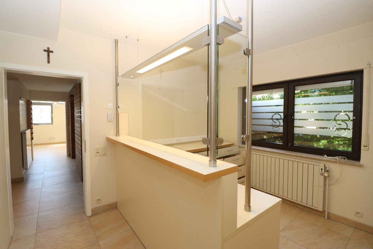 Die gesamte Fläche ist wie folgt unterteilt: rollstuhlgerechter Zugang von der Straße bis zur Eingangstür. Flur mit ausreichend Platz für eine Garderobe oder einen kleinen separaten Wartebereich (2 Personen), behindertengerechtes Gäste-WC (von allen Räumen aus zugänglich), offener, großer Wartebereich (6-8 Personen), zur rechten Seite hin Behandlungsraum 1, welcher ausgestattet ist mit Einbaumöbeln, Waschbecken, usw… sowie Fenster. Zur anderen Seite hin befindet sich eine Empfangstheke mit komplett ausgestattetem Sekretariatsmobiliar sowie natürlichem Lichteinfall durch ein großes Fenster. Im Anschluss befindet sich der Behandlungsraum 2 ebenfalls ausgestattet mit Waschbecken, Einbaumöbeln sowie Fenster.