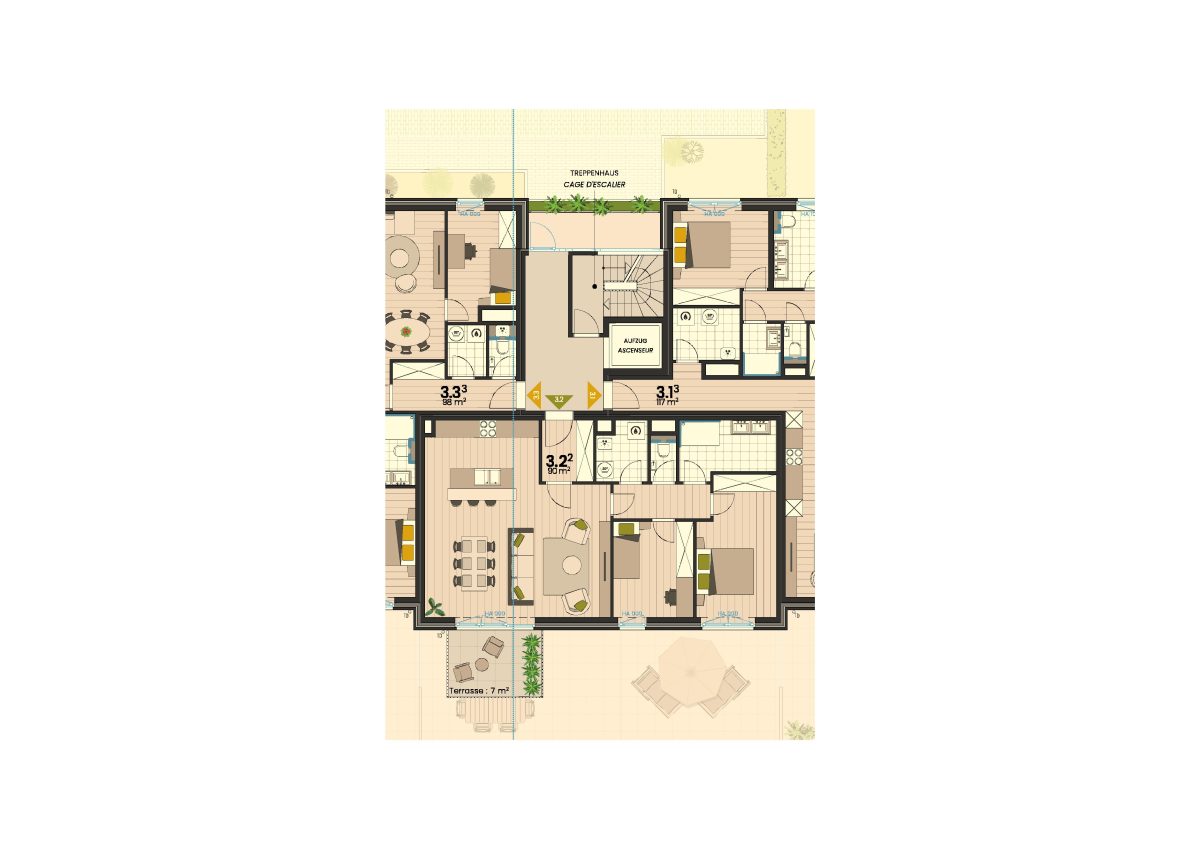 Neben dem Eingang finden Sie im Erdgeschoss der Residenz 12 Innenstellplätze, 11 Privatkeller, Fahrradabstellplätze sowie Zähler-, und Technikraum. Die Zufahrt zur Garage erfolgt über den Parkplatz Loten.