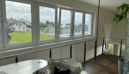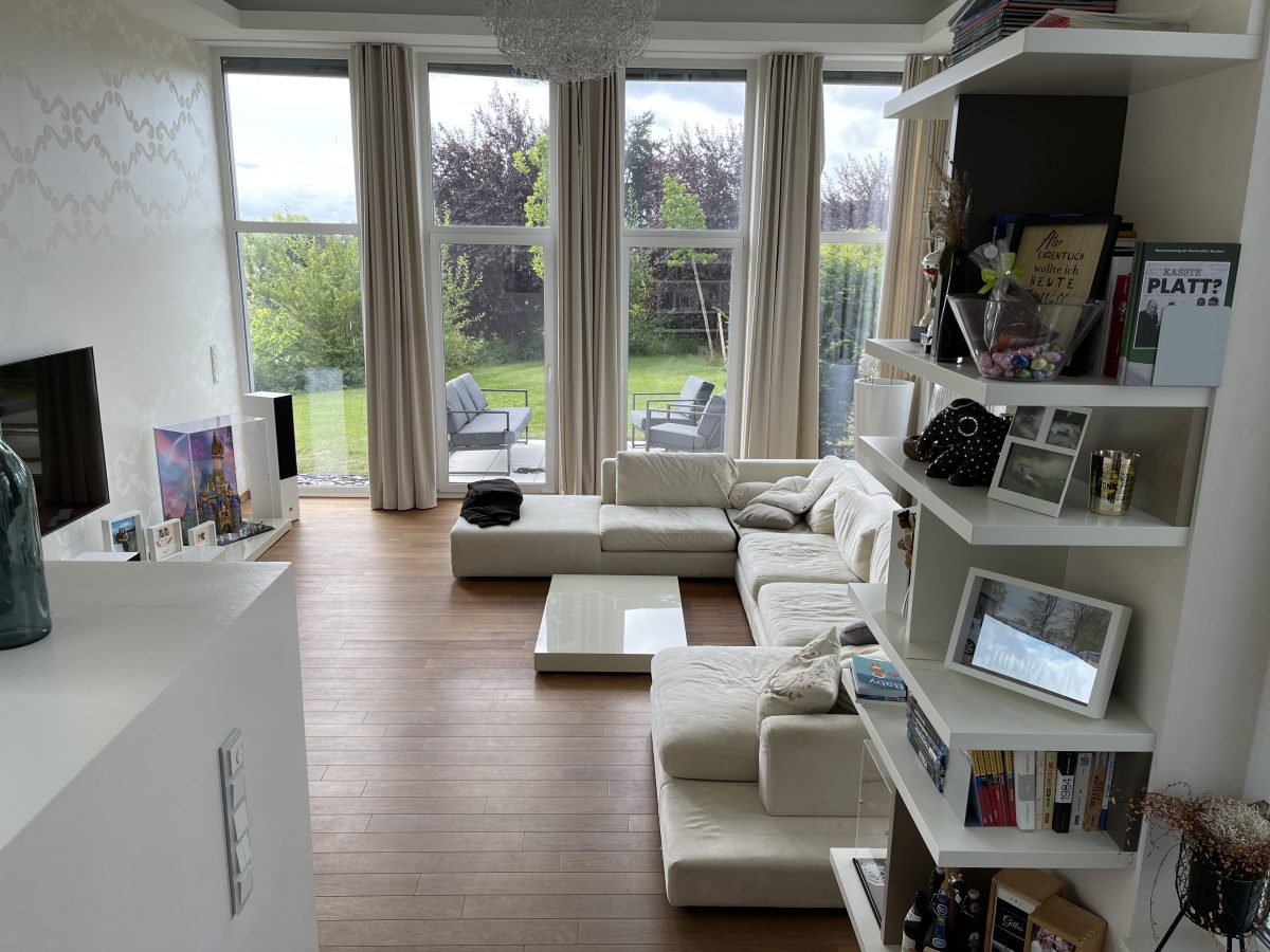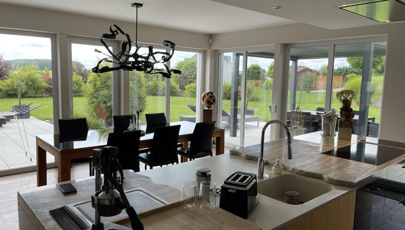 Die ästhetische Fassade mit den bodentiefen Fenstern fügt sich harmonisch in die Umgebung ein.