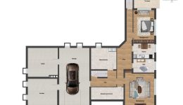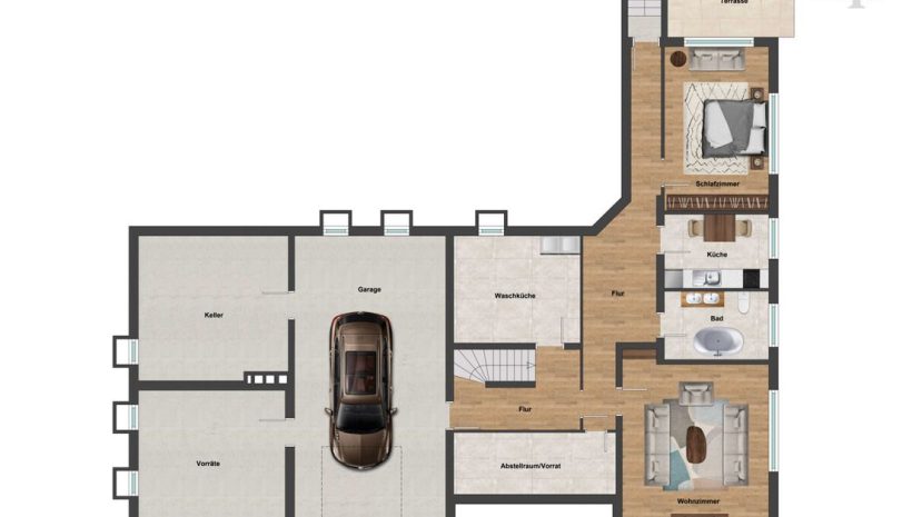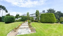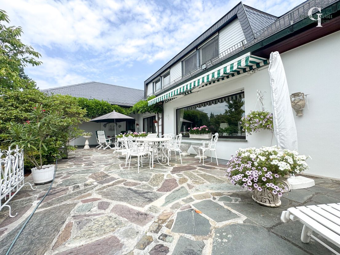 An der Vorderseite des Hauses befindet sich eine überdachte Terrasse, die zu gemütlichen Stunden bei jedem Wetter einlädt, während auf der Rückseite eine große Sonnenterrasse mit ca. 75 m² ideal für Sonnenanbeter und gesellige Runden ist. Zum Anwesen gehören zudem eine Doppelgarage für max. 3 Fahrzeuge sowie eine Einliegerwohnung mit einer Wohnfläche von ca. 80 m², die an ein freundliches Ehepaar vermietet ist und eine angenehme, zuverlässige Einnahmequelle darstellt.