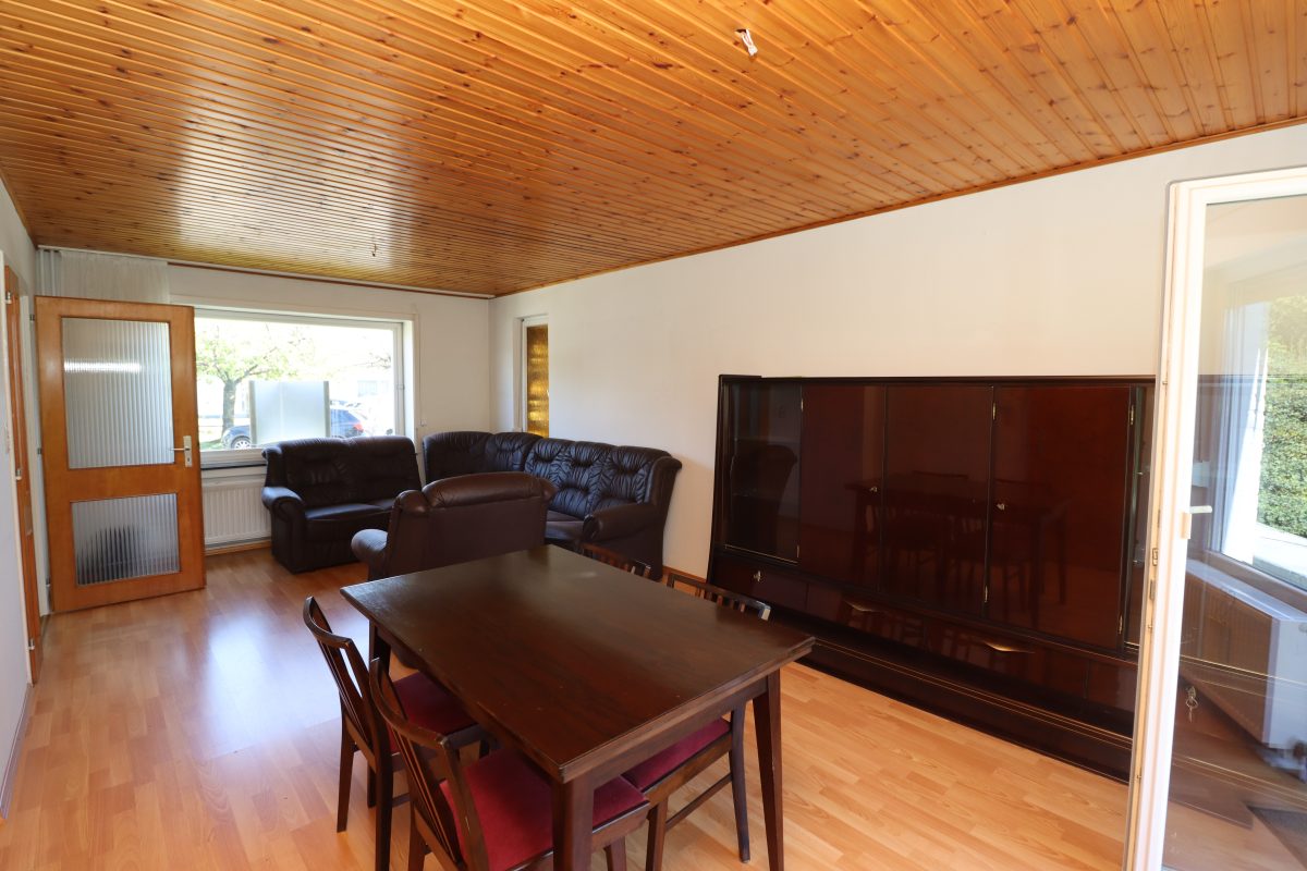 Das Haus erstreckt sich über drei Ebenen: Keller, Erdgeschoss und Dachgeschoss. Beim Betreten der Immobilie gelangen Sie direkt in einen großzügigen Wohn- und Essbereich, der sich durch große Fensterflächen auszeichnet. Diese sorgen für ein angenehmes Tageslicht und eröffnen den Blick auf die ruhige, von blühenden Bäumen gesäumte Straße sowie den kleinen Garten mit Gartenhaus.