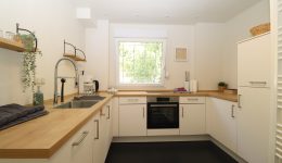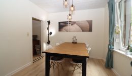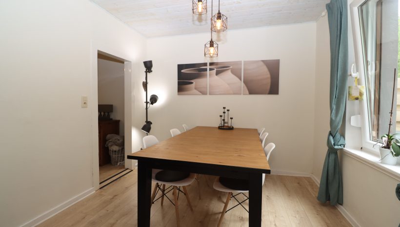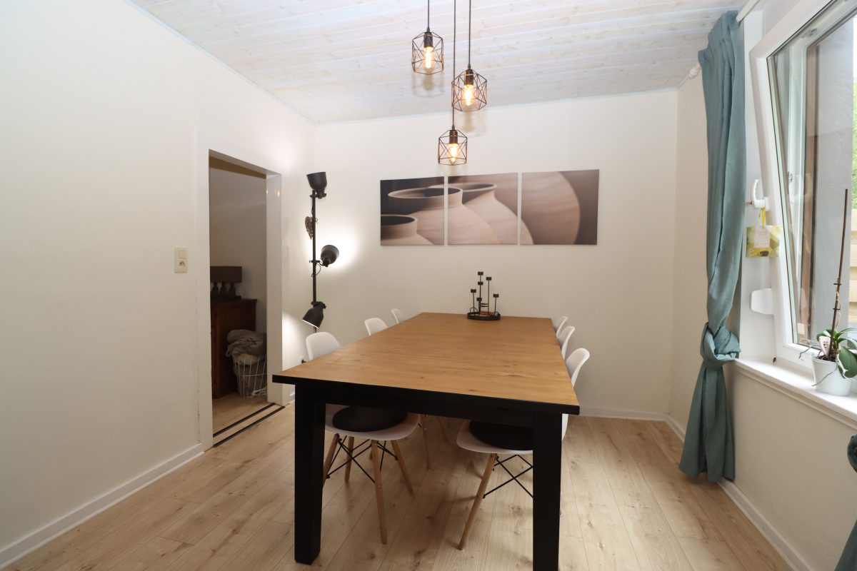 Erdgeschoss: Ein lichtdurchflutetes Esszimmer auf der rechten Seite führt in ein einladendes Wohnzimmer. Auf der linken Seite des Eingangsbereichs befindet sich die separate, voll ausgestattete Küche – praktisch und modern gestaltet – sowie ein Gäste-WC.