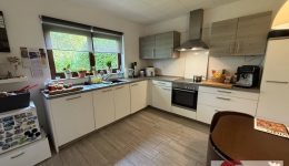 Direkt daneben befindet sich die ca. 11 m² große Küche, die dank der neuwertigen, zeitlos schönen Einbauküche mit Elektrogeräten nicht nur funktional, sondern auch stilvoll ist. Ob gemütliches Frühstück am Tisch oder Kochen mit Freunden – diese Küche lädt zum Verweilen ein. Besonders praktisch: Der direkte Zugang von der Garage sorgt dafür, dass Einkäufe im Handumdrehen verstaut sind. Die Garage selbst bietet Platz für Ihren PKW und zusätzlich Stauraum für Vorräte oder Hobbys.