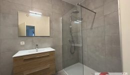 Badezimmer mit italienischer Dusche, Waschtisch mit Unterschrank und Spiegel