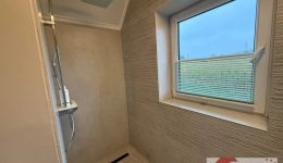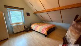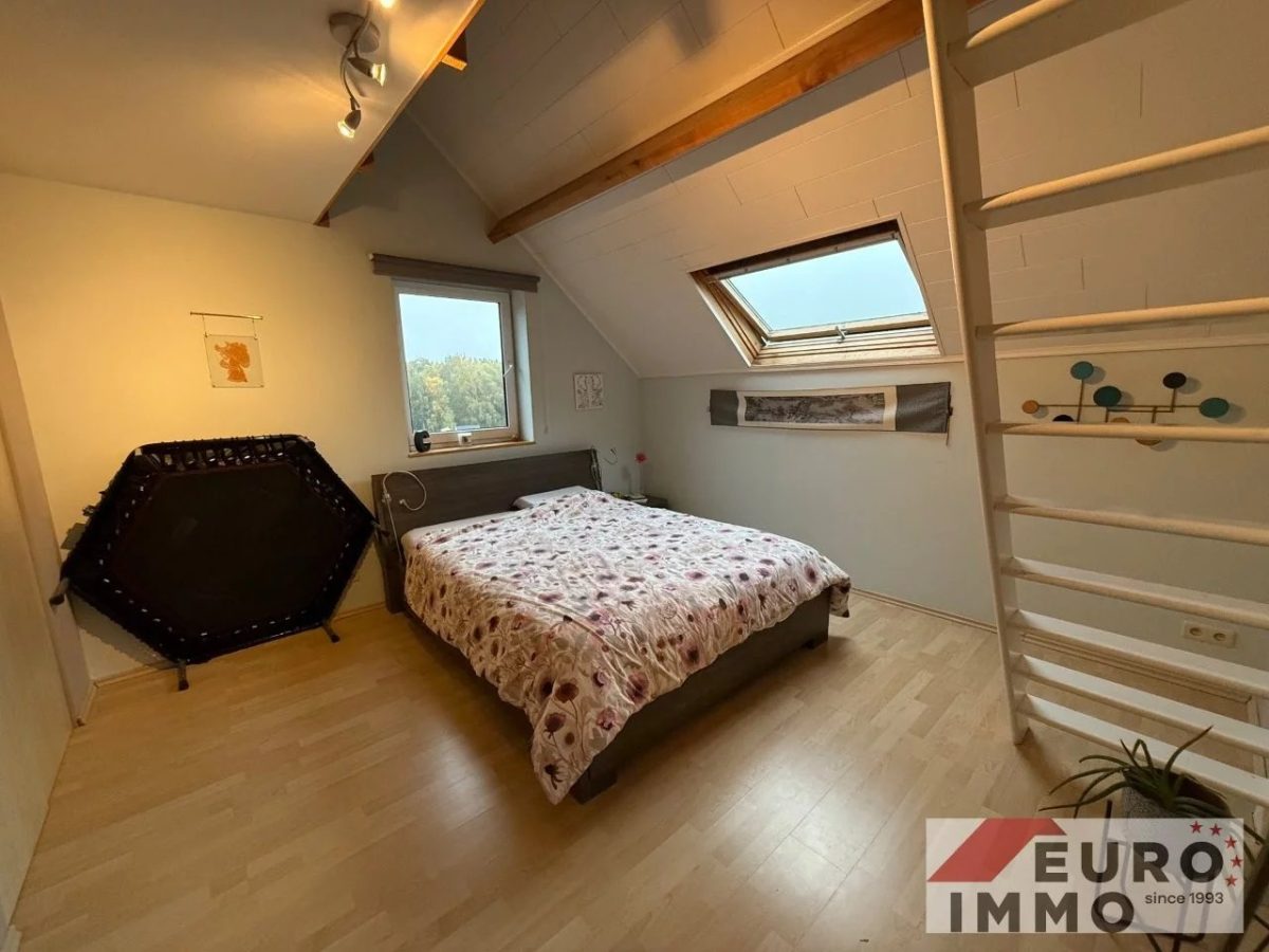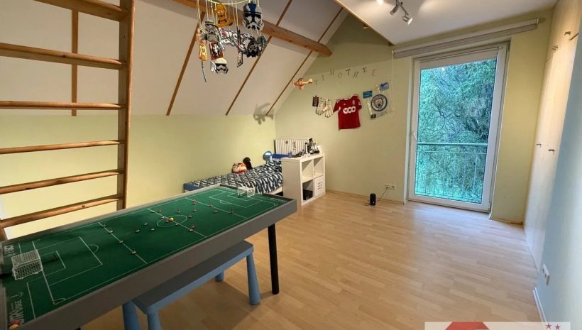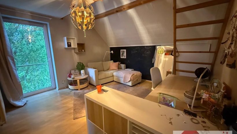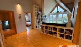 Das Obergeschoss bietet viel Raum für Privatsphäre und Rückzug. Direkt oben angekommen, empfängt Sie ein offener Raum von ca. 26 m² mit Parkettboden – ideal als zweiter Wohnbereich, Büro oder Leseecke. Die großzügige Fenstergaube mit bodentiefem Fenster öffnet den Blick auf die grüne Umgebung und schafft eine Atmosphäre der Ruhe und Weite – ein Ort zum Durchatmen.