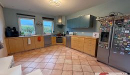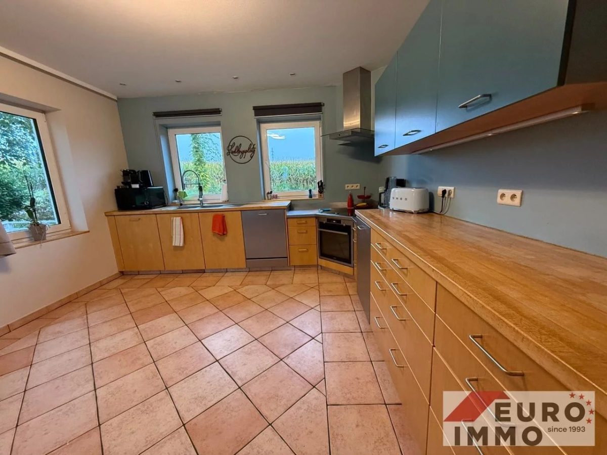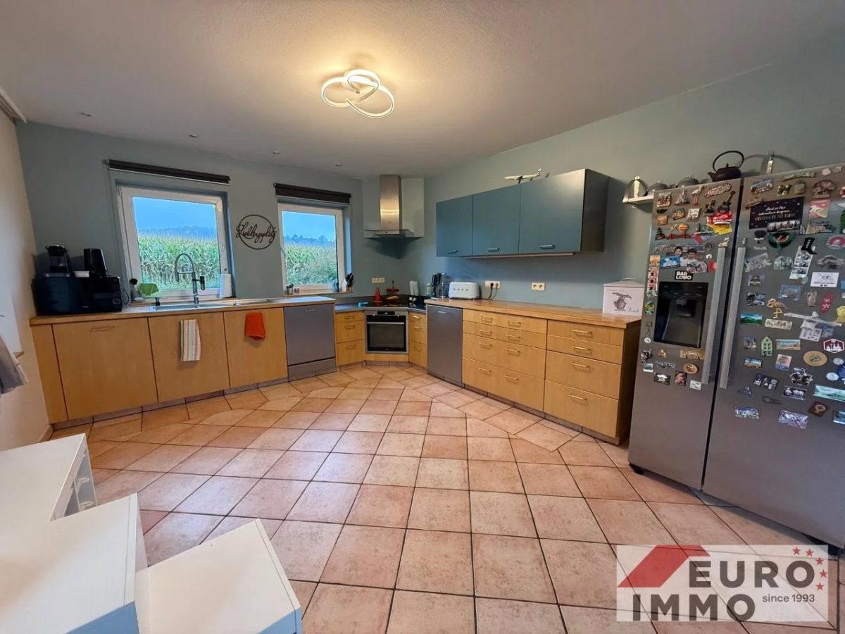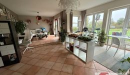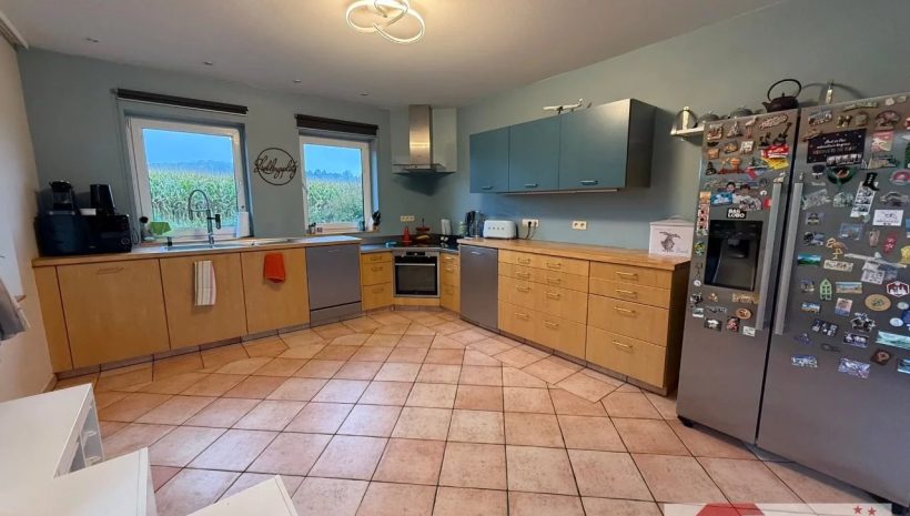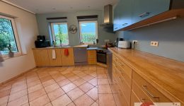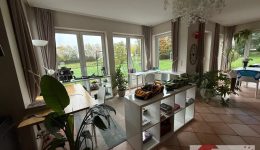 Die leicht erhöhte, durch eine Stufe abgetrennte Bibliotheksecke schafft eine angenehme Raumdynamik und lädt zum Entspannen ein. In der Wohnküche sorgt eine moderne, zeitlose Einbauküche für Stil und Funktionalität. Von hier aus öffnet sich der Blick auf weite Felder – der perfekte Ort für gemeinsame Mahlzeiten mit Aussicht. Dank der Größe findet auch ein Esstisch bequem Platz. Der gesamte Wohnbereich ist ebenfalls mit pflegeleichten Terracotta-Fliesen ausgestattet.