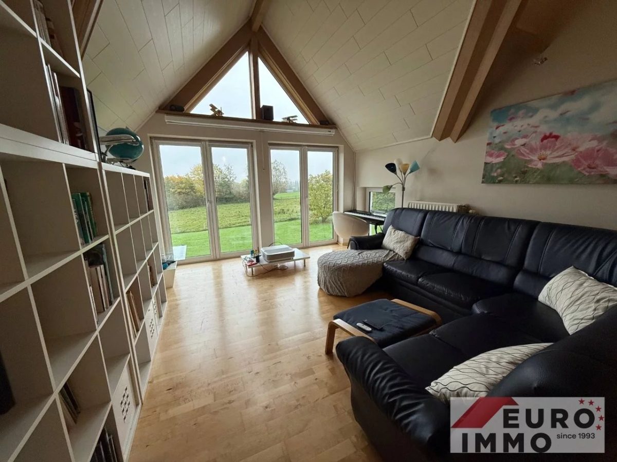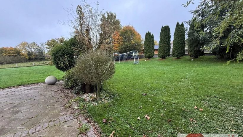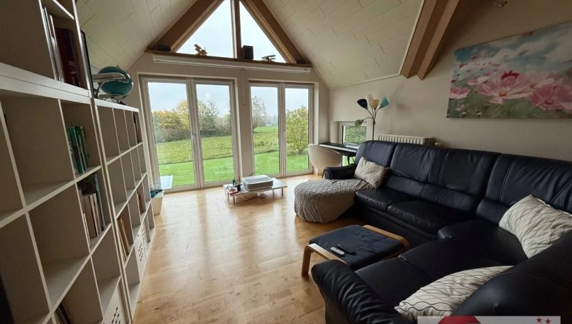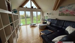 Der Außenbereich ist ein Paradies für Groß und Klein: Kinder finden hier Platz zum Spielen und Toben, während Erwachsene auf der großzügigen Terrasse entspannen oder mit Freunden gemütliche Abende verbringen können. Der freie Blick über Wiesen und Felder ist atemberaubend und vermittelt ein Gefühl von Weite und Freiheit.
