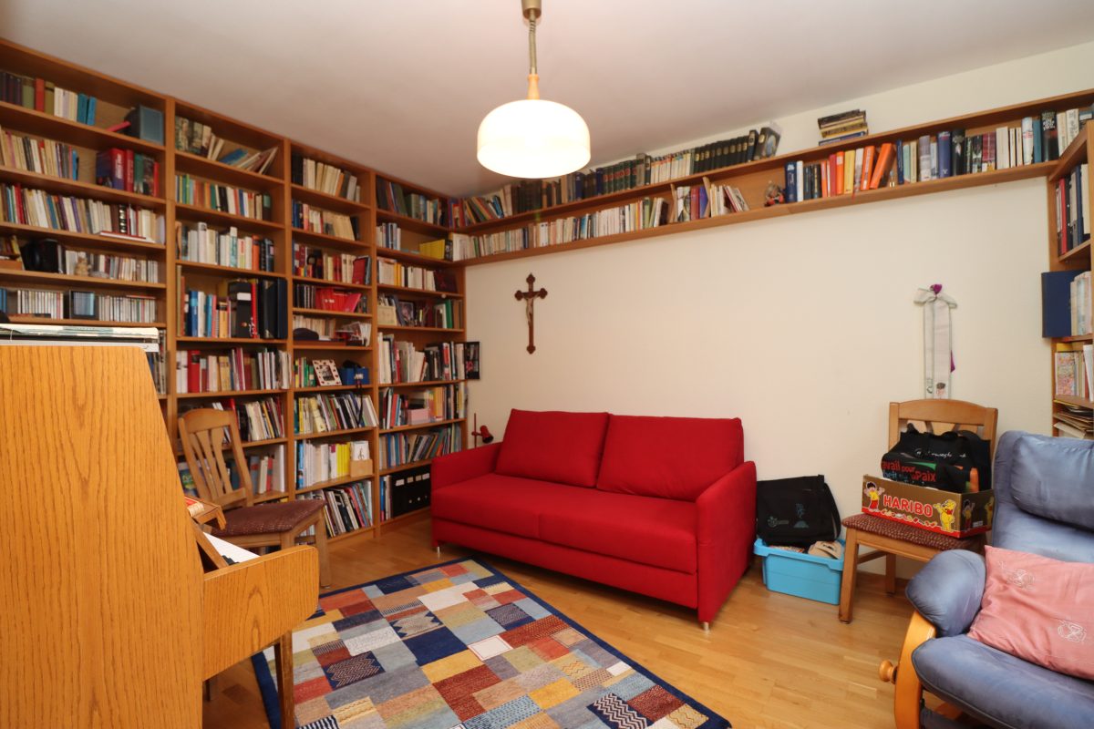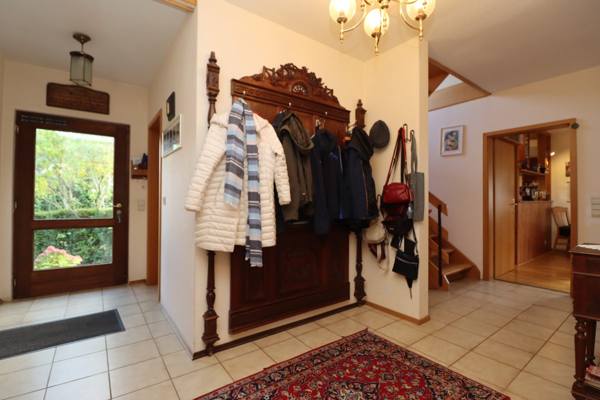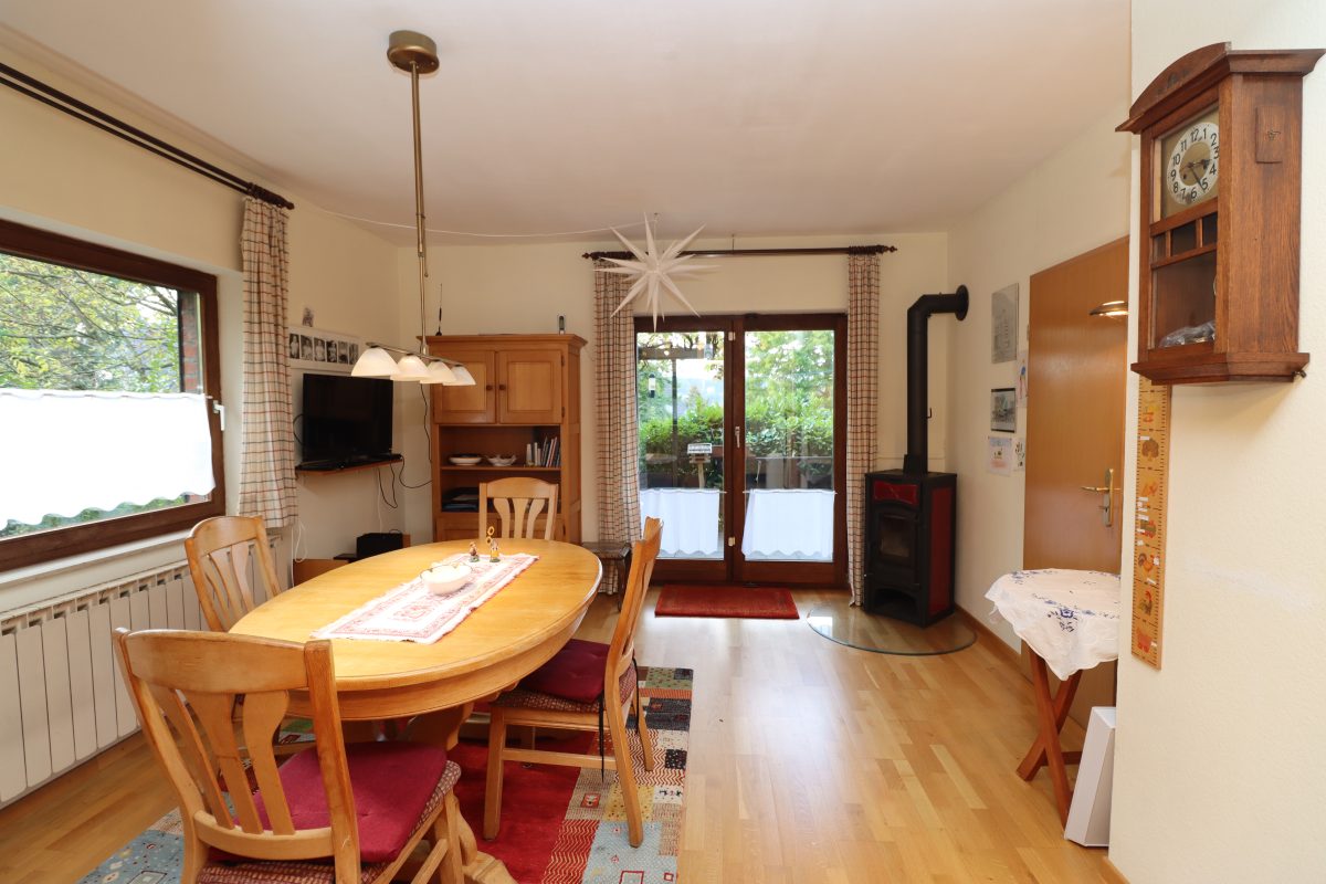Über den einladenden Eingangsbereich gelangt man in das Herz des Hauses. Im Erdgeschoss befinden sich neben einem Schlafzimmer (Büro oder Gästezimmer) mit angrenzendem Duschbad die Küche mit Kamin und Essbereich sowie das großzügige Wohnzimmer. Sowohl Küche als auch Wohnraum führen direkt auf die sonnige Terrasse und in den Garten – ein idealer Ort, um entspannte Stunden im Grünen zu verbringen.