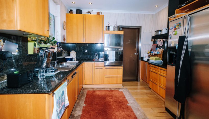 Die offene Einbauküche verbindet sich harmonisch mit dem Wohn- und Esszimmer, von wo aus Sie direkten Zugang zur gepflegten Rasenfläche haben.
