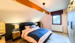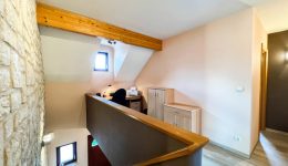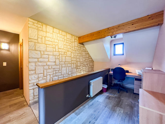 Im Obergeschoss befinden sich ein Bürobereich, vier komfortable Schlafzimmer mit 15 m², 11 m², 14 m² und 17 m² sowie ein Badezimmer mit Badewanne und Dusche. Holzrahmenfenster mit Doppelverglasung, Rollläden, Sonnenmarkise und eine bis 2026 konforme Elektrik zeugen von guter Pflege.