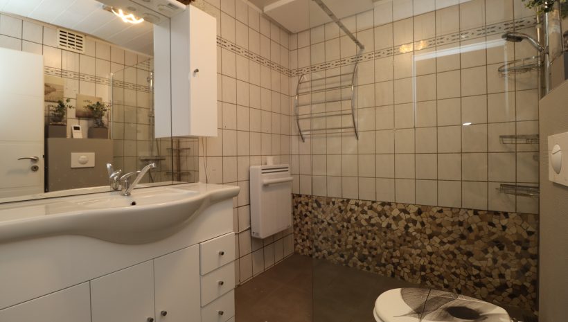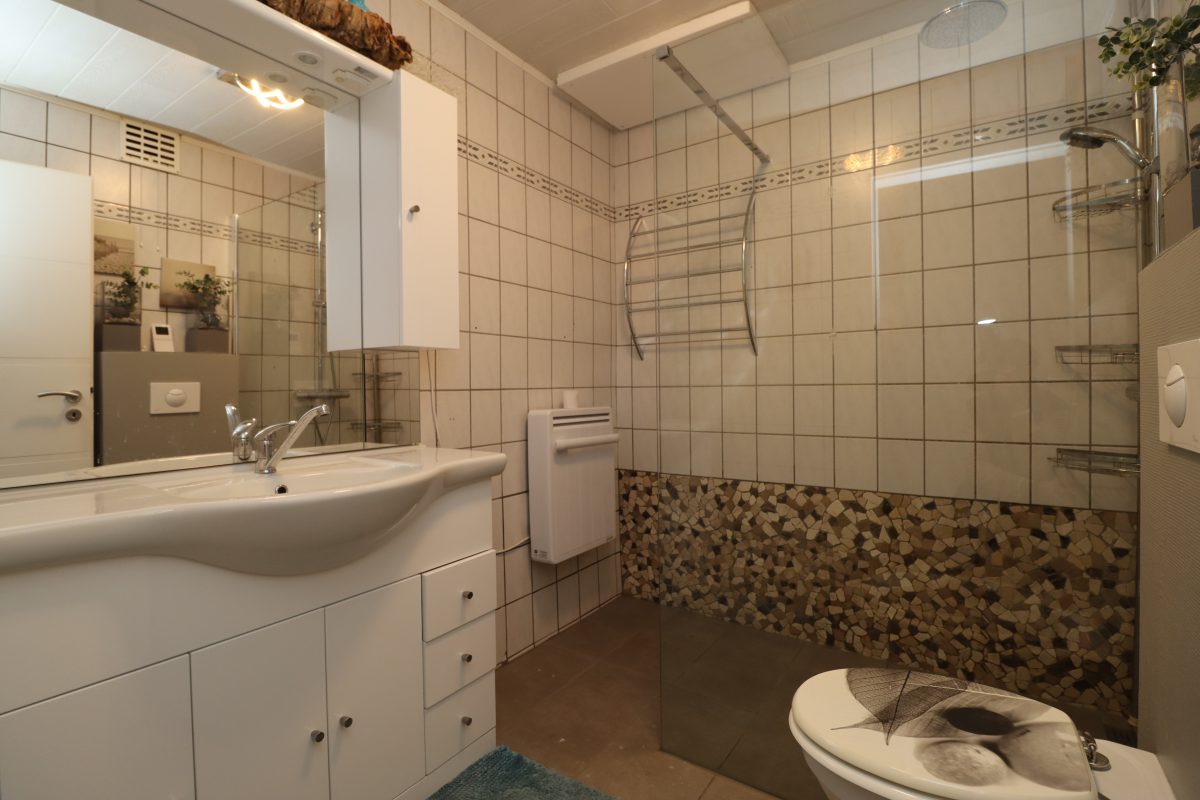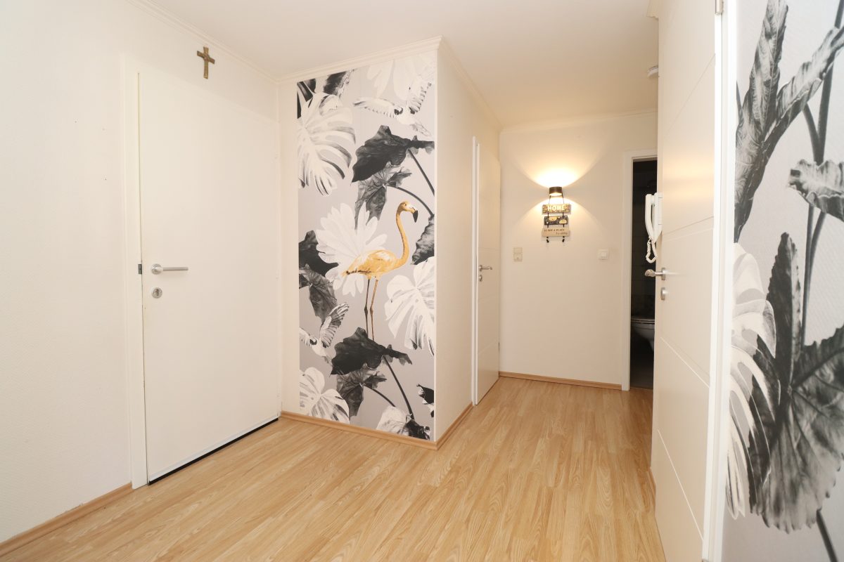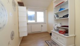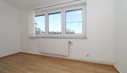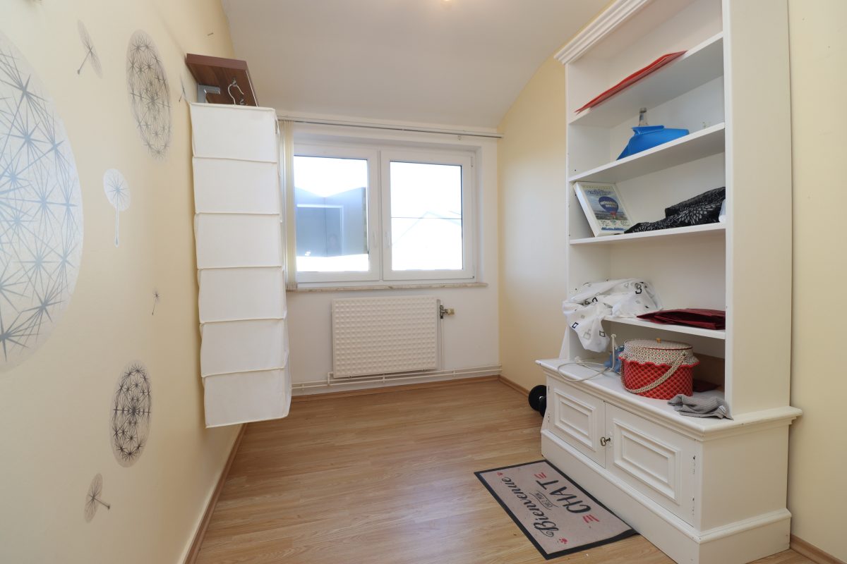 Alle Räumlichkeiten der Wohnung befinden sich auf einer Ebene, was die Wohnfläche von insgesamt 75 m² optimal nutzbar macht. Die Wohnung verfügt über drei Schlafzimmer: ein geräumiges Hauptschlafzimmer und zwei kleinere Zimmer, die sich ideal als Kinder-, Gästezimmer oder Büro nutzen lassen. Das Badezimmer ist ausgestattet mit einer bodengleichen Dusche, einem WC und einem Waschbecken.