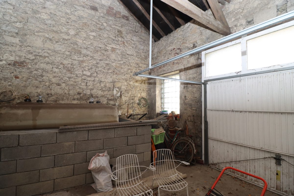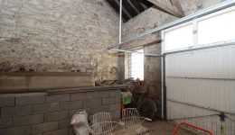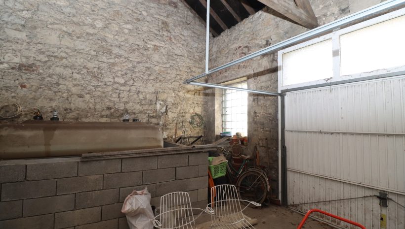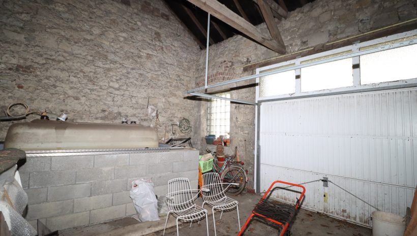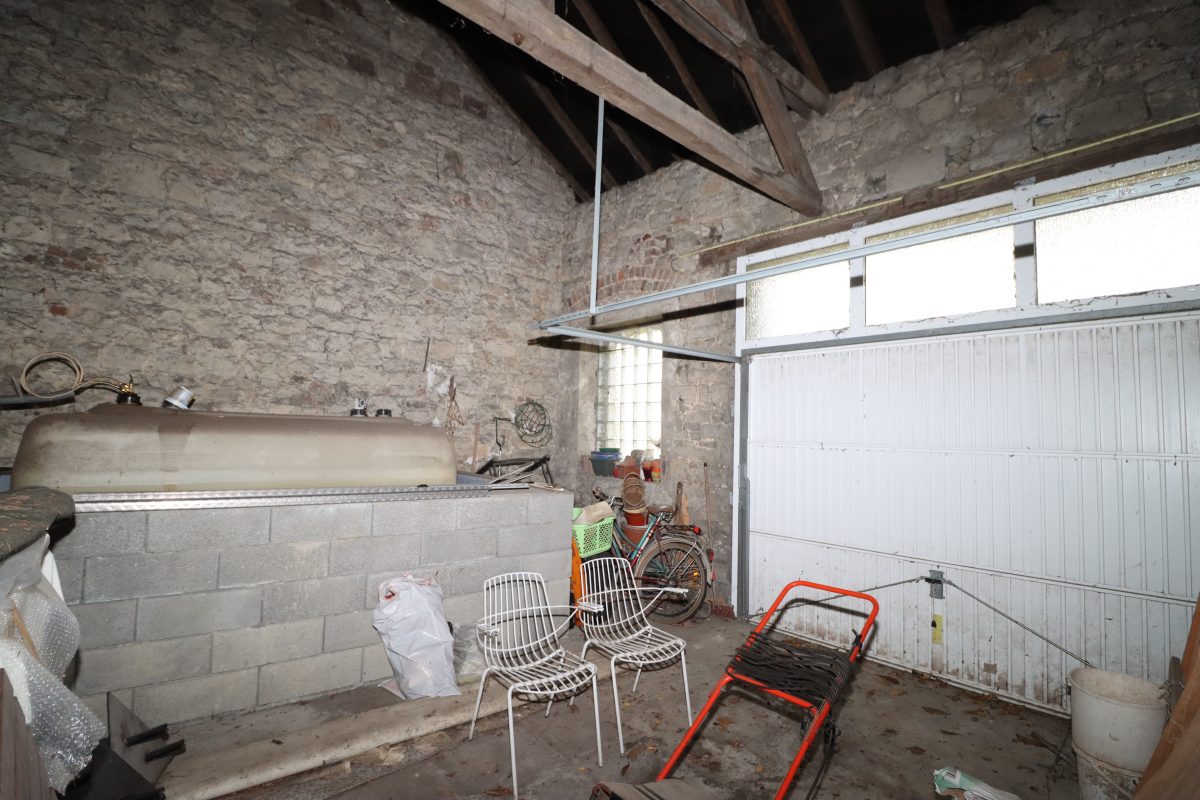 Beim Betreten der Immobilie empfängt Sie ein großzügiger Eingangsbereich mit einem gemütlichen Kamin, der sofort ein behagliches Ambiente schafft. Auf der linken Seite befindet sich ein Raum, der als Schlafzimmer genutzt wurde, sich aber hervorragend als Wohnzimmer eignet. Auf der rechten Seite des Eingangsbereichs befindet sich die separate Küche. An diese grenzt ein Badezimmer, ausgestattet mit einem Waschbecken, einer Toilette und einer Badewanne. Von der Küche aus erreichen Sie außerdem einen praktischen Abstellraum, eine Waschküche sowie eine geräumige Garage. Aufgrund des geräumigen Platzangebots wäre hier ebenfalls die Einrichtung eines Ateliers oder einer Werkstatt denkbar. Fahrzeuge könnten vor der Garage geparkt werden.