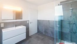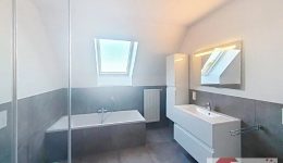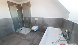 Auf derselben Etage liegen außerdem ein praktischer Abstellraum mit Anschluss für Waschmaschine und Platz für Vorräte, ein erstes Schlafzimmer sowie das stilvoll gestaltete Badezimmer mit Badewanne, bodengleicher Dusche und modernem Waschtisch. Unter der Treppe steht zusätzlicher Stauraum zur Verfügung.