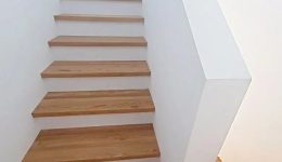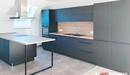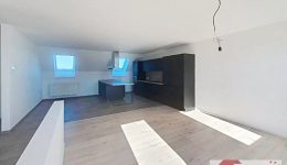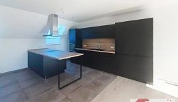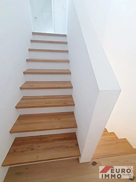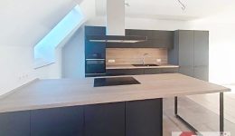 Einige Stufen führen hinauf in den lichtdurchfluteten Wohn- und Essbereich mit offen gestalteter, moderner Einbauküche inklusive aller Geräte. Dieser Bereich überzeugt durch klare Architektur, Helligkeit und ein angenehmes Raumgefühl.