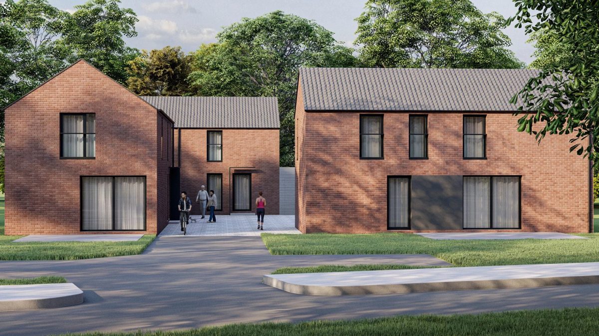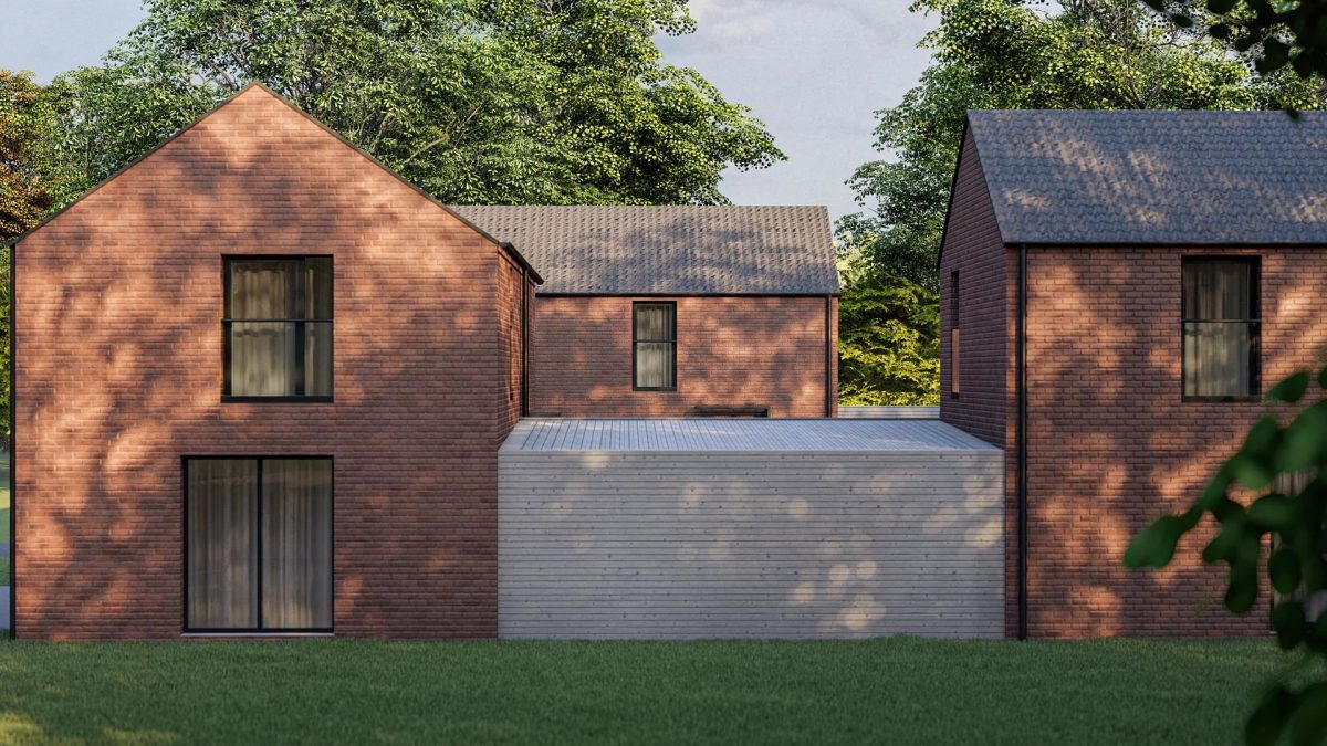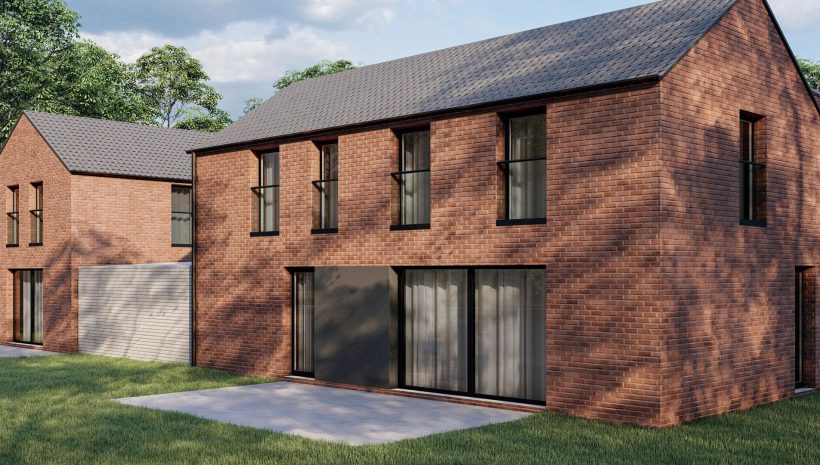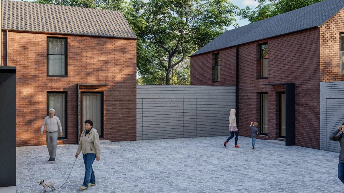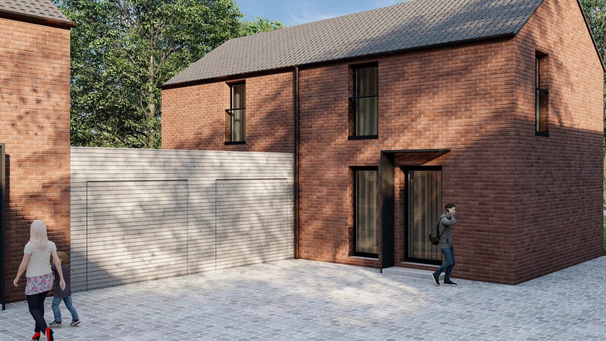 Die harmonisch in die Umgebung integrierten Einfamilienhäuser mit Satteldach, 2 Vollgeschossen und Klinkerfassade mit attraktivem Innenhof besteht aus vier Objekten (Baubeginn Spätsommer 2024).