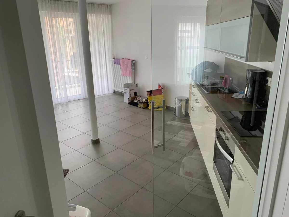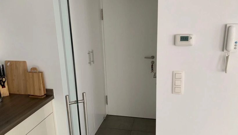 Über den gepflegten Gemeinschaftsflur gelangen Sie wahlweise über das Treppenhaus oder den Aufzug direkt zu Ihrer neuen Wohnung, die sich auf rund 54 m² erstreckt. Beim Betreten empfängt Sie eine kleine Diele, die durch eine Glastür zum Wohnbereich angenehm mit Tageslicht versorgt wird und einen direkten Zugang zum praktischen Gäste-WC bietet. Der helle und freundlich gestaltete Wohnbereich mit einer Größe von etwa 29 m² bildet das Herzstück der Wohnung. Er zeichnet sich durch eine moderne, offene Raumaufteilung aus und integriert eine zeitgemäße Einbauküche mit Elektrogeräten sowie einen harmonisch gestalteten Wohn- und Essbereich. Von hier aus gelangen Sie auf die kleine, sonnige Terrasse, die trotz ihrer kompakten Größe einen gemütlichen Platz zum Entspannen bietet.