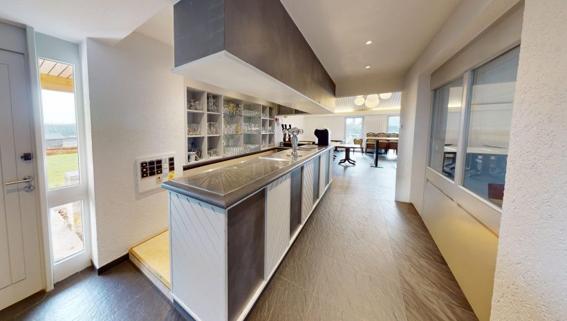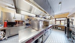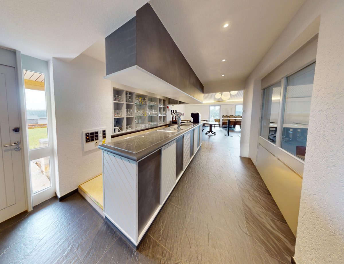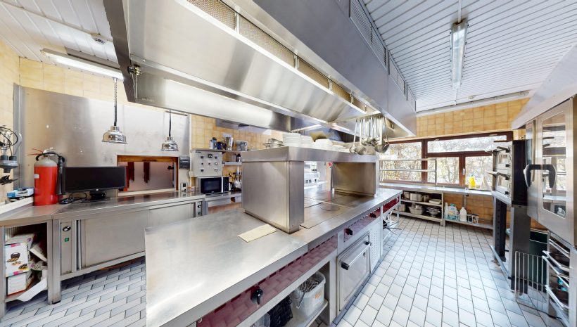 Die angrenzende, 53 m² große Küche ist modern ausgestattet und ermöglicht reibungslose Abläufe zwischen Restaurant und Veranstaltungssaal.
