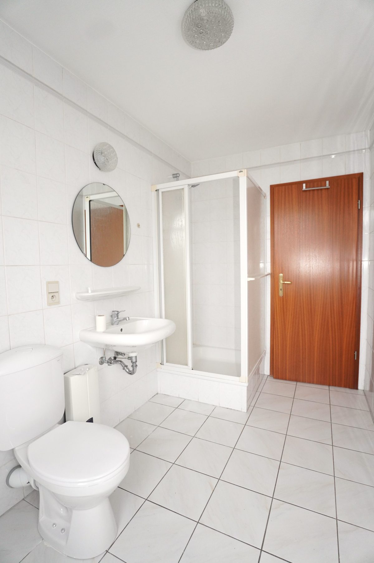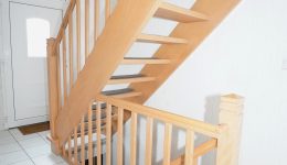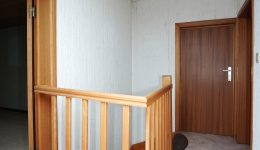 1. Stock: Flur mit Holztreppenhaus, das zum zweiten Stock führt. Heller Wohnbereich mit Zugang zum ideal besonnten Balkon, Küchenbereich, der problemlos in ein zusätzliches Schlafzimmer umgewandelt werden könnte, ein Schlafzimmer sowie ein zweites Badezimmer mit Dusche, Waschbecken und WC.