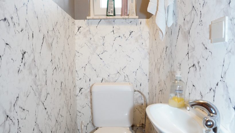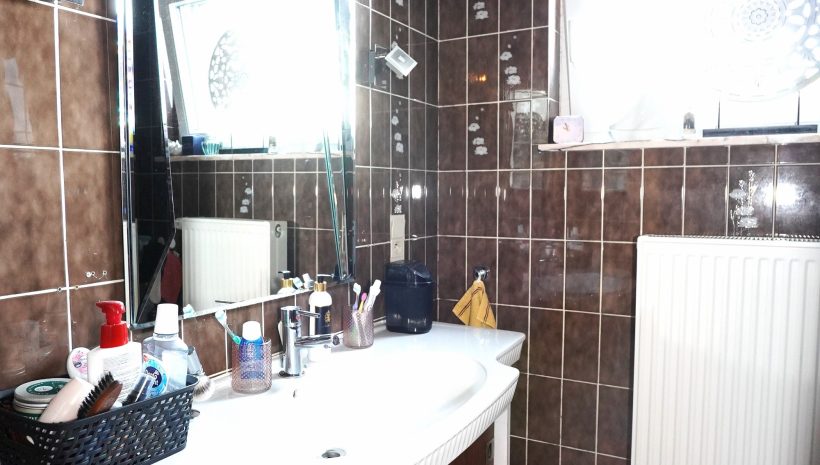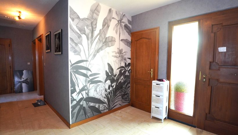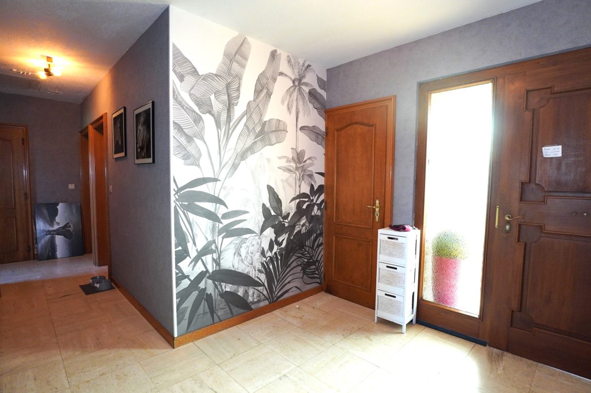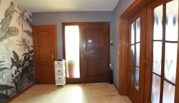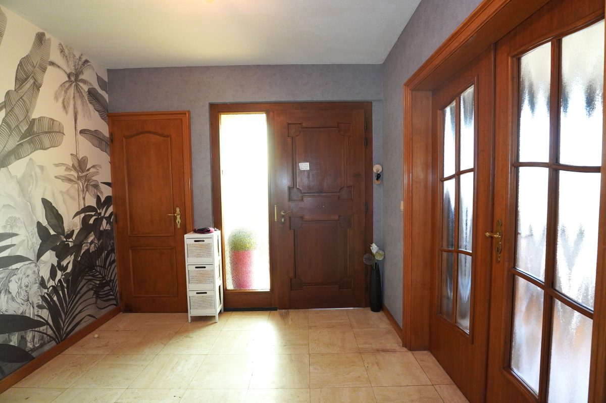 Geräumiger Eingangsbereich, der zu allen Räumen des Hauses führt; separates WC; das helle Wohnzimmer ist über eine doppelte Holzglastür zugänglich. Die Küche ist mit einer Einbauküche (ohne Kühlschrank) ausgestattet und offen zum Esszimmer hin.
