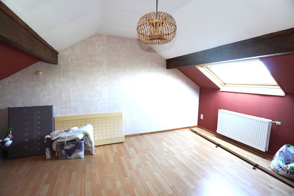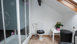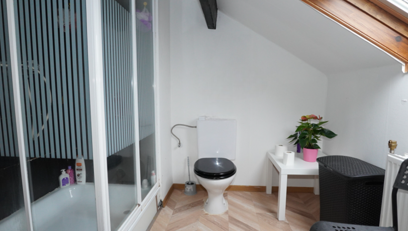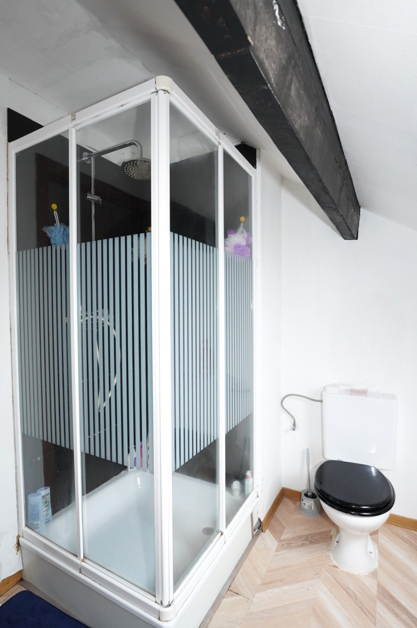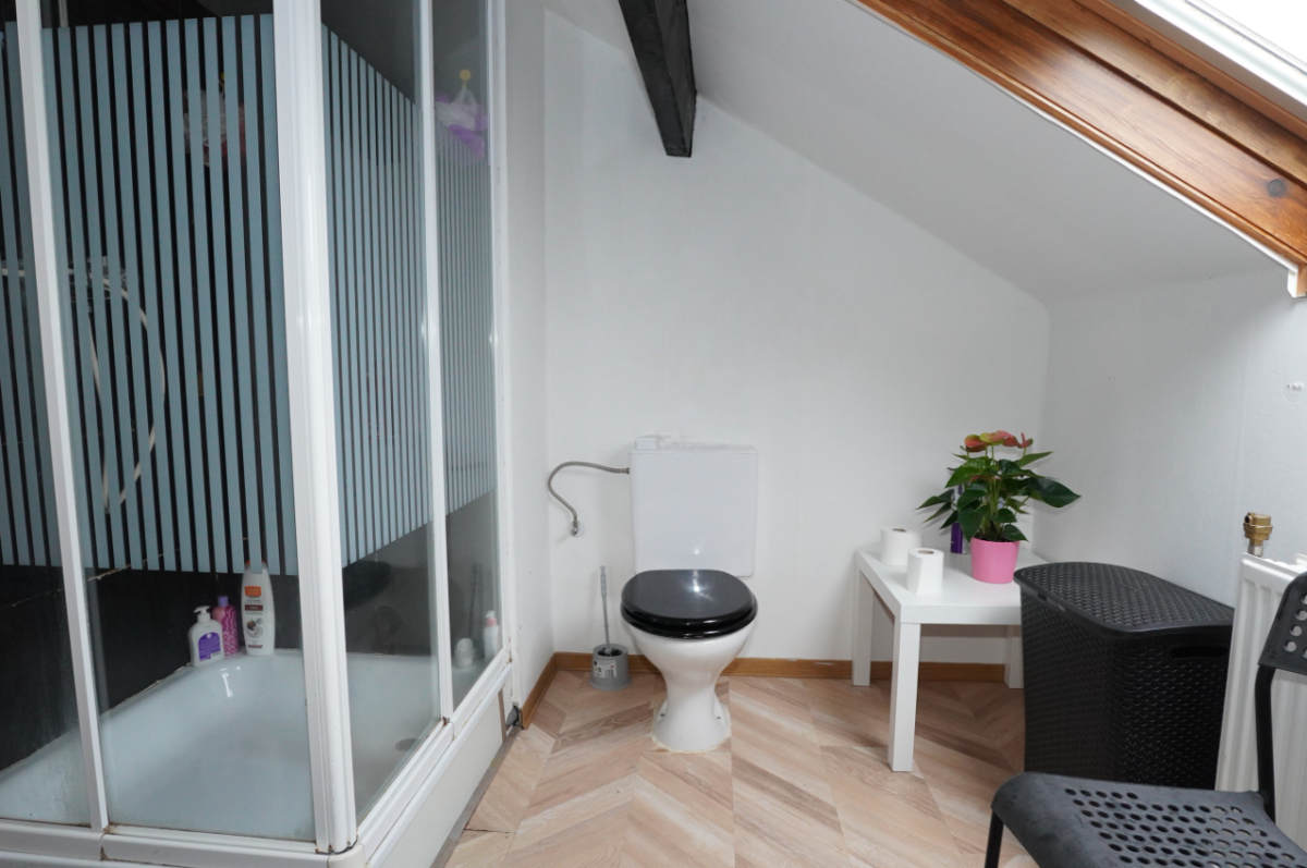 Das Obergeschoss ist über die Küche zugänglich und besteht aus einem Nachtflur, einem kleinen Duschbad (mit Dusche, Waschbecken und Toilette) und zwei Schlafzimmern im Dachgeschoss.