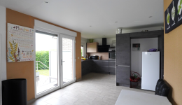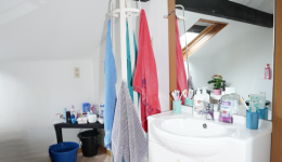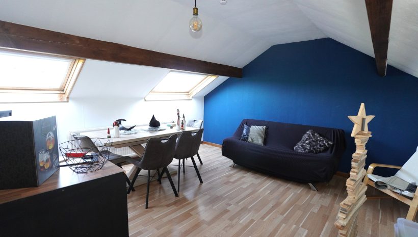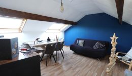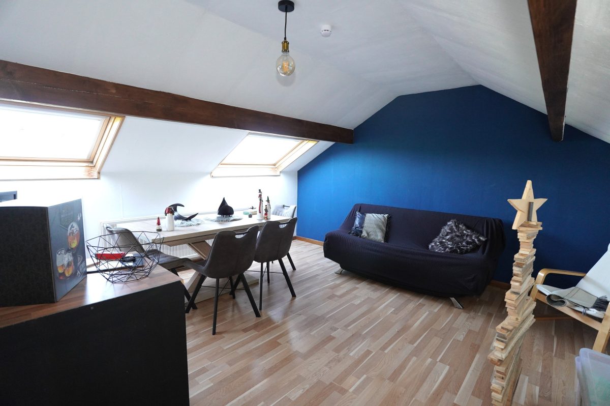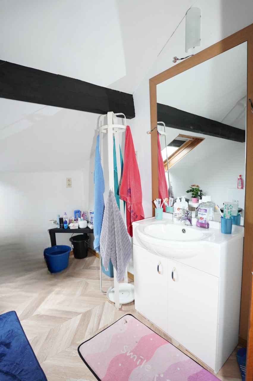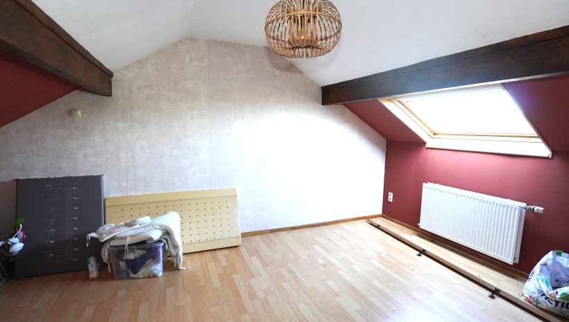 Das Obergeschoss ist über die Küche zugänglich und besteht aus einem Nachtflur, einem kleinen Duschbad (mit Dusche, Waschbecken und Toilette) und zwei Schlafzimmern im Dachgeschoss.