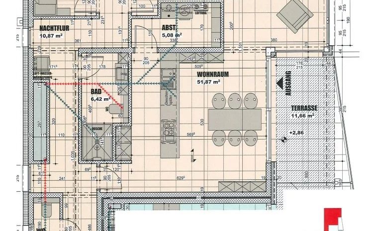 Der einladende Eingangsbereich von etwa 9 m² bietet Platz für eine Garderobe und verfügt über ein separates Gäste-WC. Der offene Wohn-, Ess- und Kochbereich mit rund 52 m² bildet das Herzstück der Wohnung. Hier ermöglichen großflächige Fensterfronten helle, offene Räume, die zum Entspannen, Genießen und Gestalten einladen. Die offene Küche (ohne Einbauküche) erlaubt eine moderne Wohnkonzeption, während der angrenzende Hauswirtschaftsraum mit circa 5 m² zusätzlichen Stauraum für Vorräte und Waschmaschine bietet. Über den Wohnbereich erreichen Sie die herrliche Terrasse, die Ihnen sonnige Stunden und entspannte Auszeiten an der frischen Luft ermöglicht. Der Nachtbereich umfasst einen kleinen Flur ( ca.11 m²), ein modernes Bad (ca. 6 m²) mit italienischer Dusche, WC und Waschbecken sowie zwei angenehme Schlafzimmer mit etwa 14 m² und 12 m².