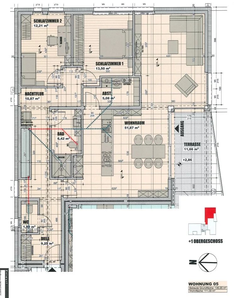 Im ersten Geschoss der Residenz präsentieren wir Ihnen die Wohneinheit Nr. 5 mit einer Wohnfläche von ca. 111 m², einer Sonnenterrasse von ca. 12 m², einem eigenen Kellerraum von ca. 15 m² sowie einem Tiefgaragenstellplatz und einem Außenparkplatz.