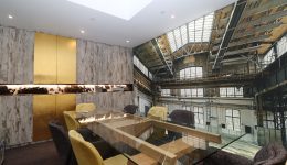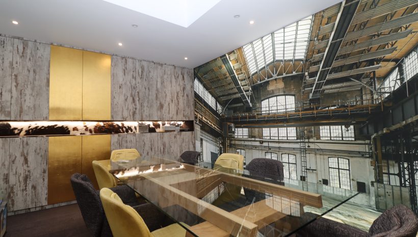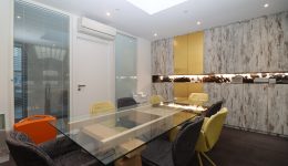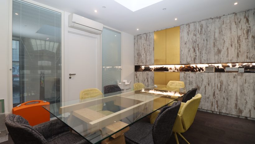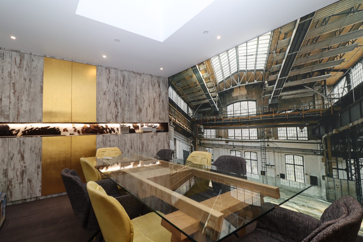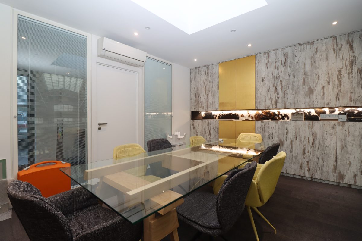 Der Konferenzraum mit bis zu 10 Sitzplätzen wirkt einladend. Das Großraumbüro umfasst 5-8 Arbeitsplätze, die -bis auf die Bürostühle- voll möbliert sind. Dem schließen sich 2 separate, verglaste Büroräume an.